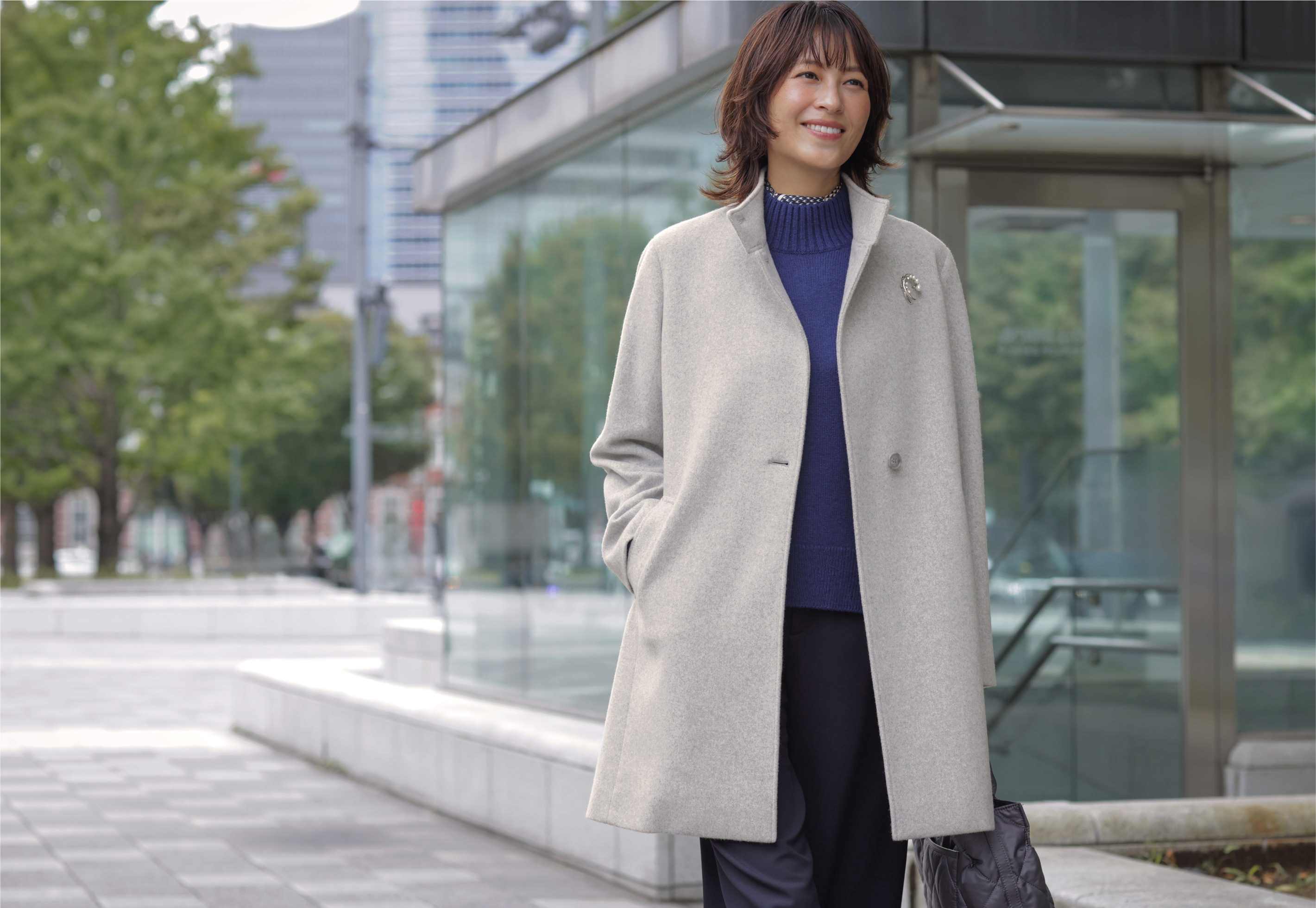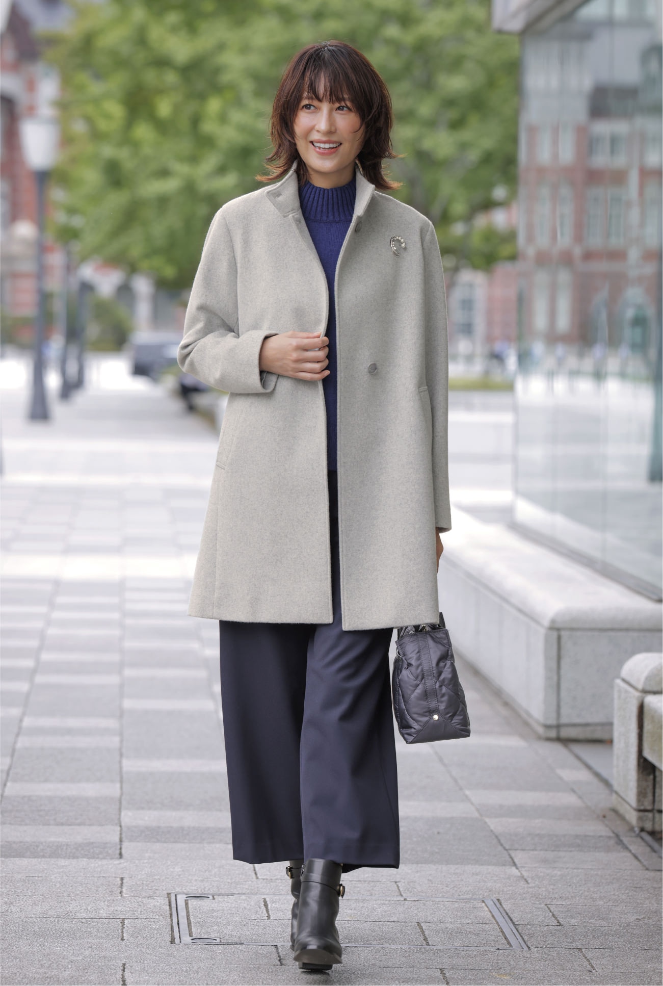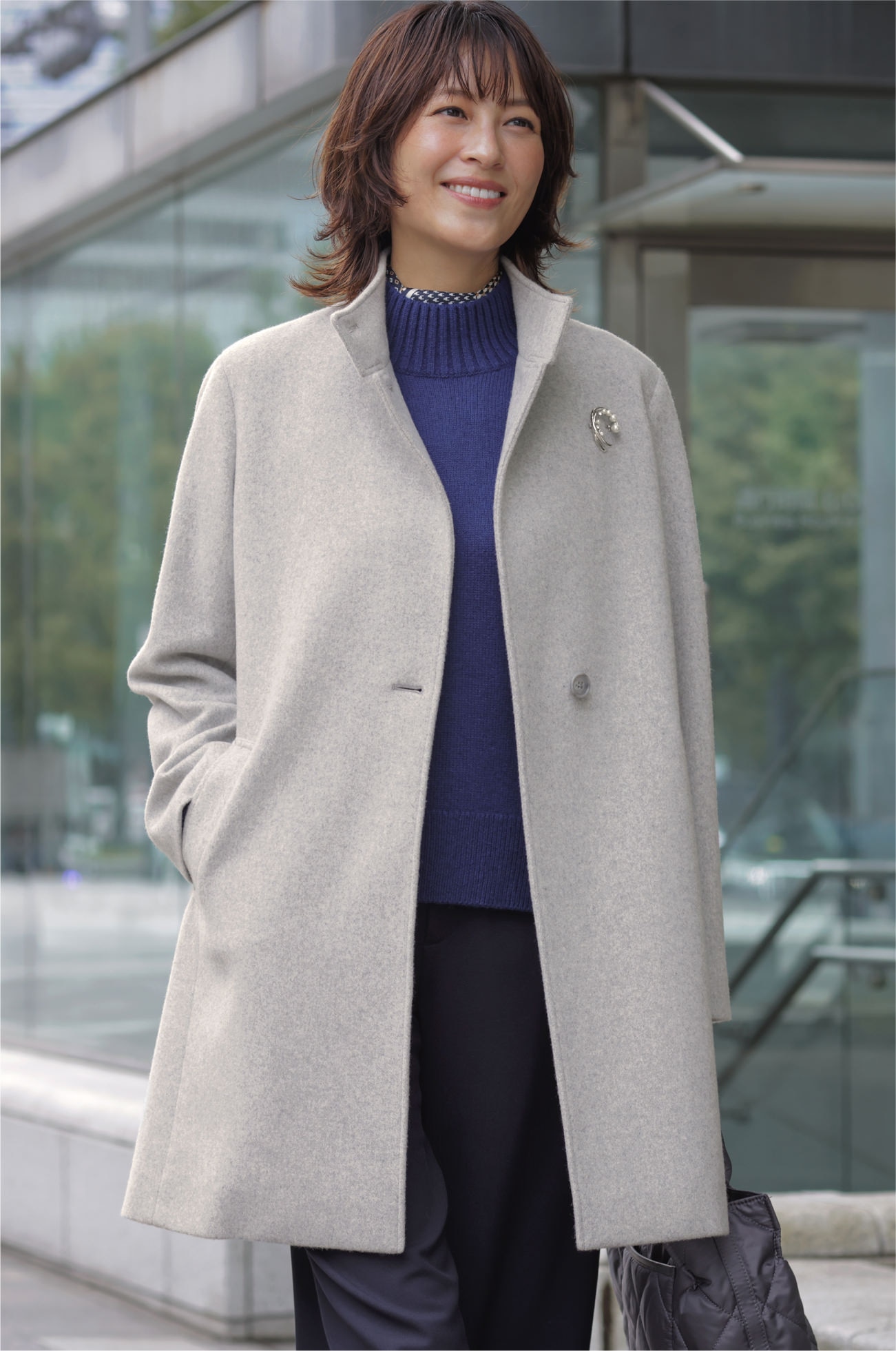 新年の通勤は、きっちりとした印象のスタンドカラーコートで気を引き締めつつも、トップグレーカラーで爽やかに仕上げる。
