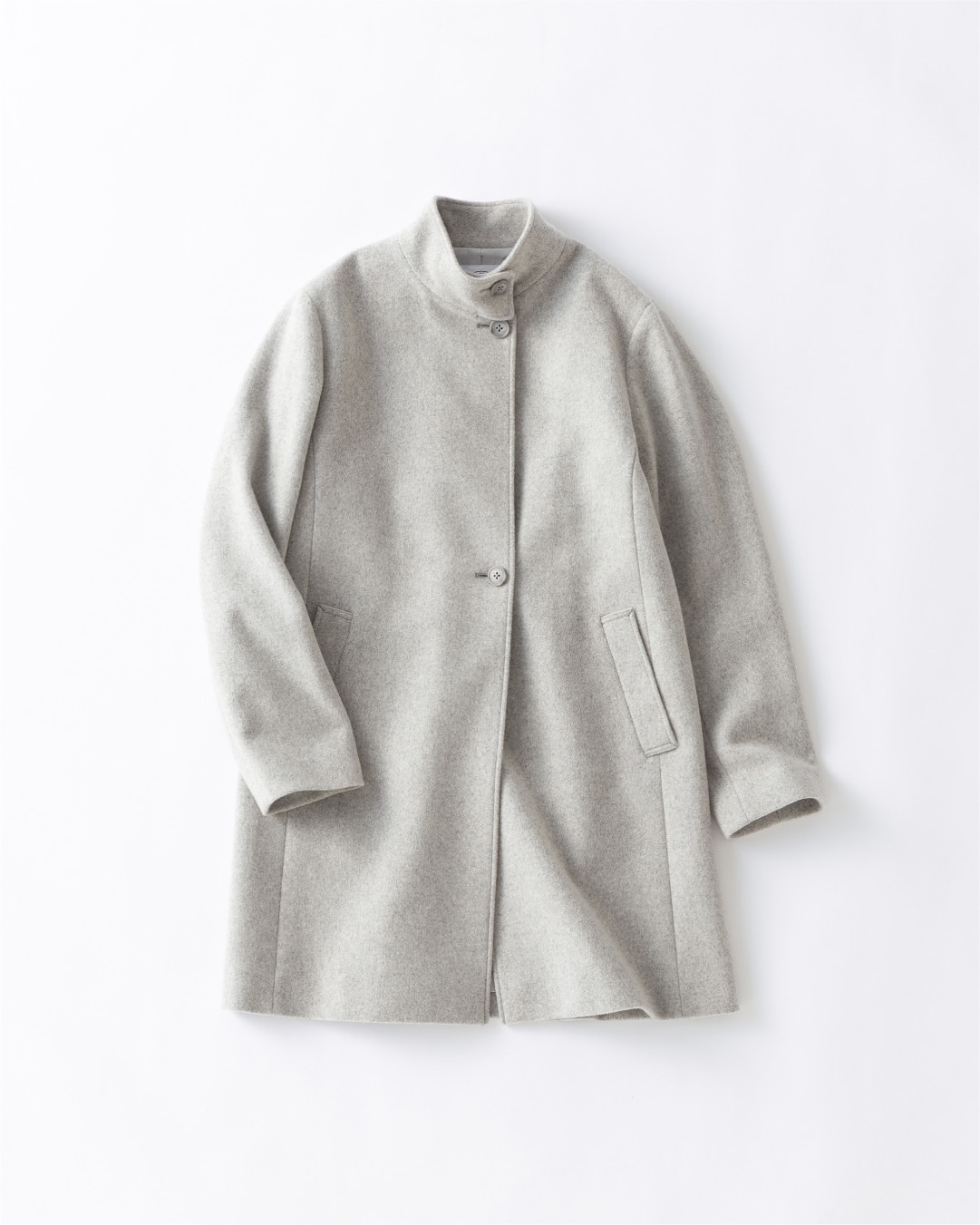 羽織るだけで洗練された印象を与えてくれるスタンドカラーコート。ボトムスを選ばない丈感で、滑らかな肌触りと軽やかな着心地がポイント。