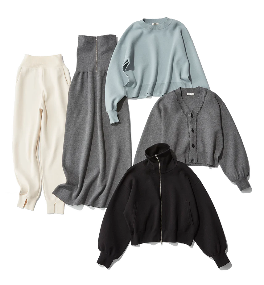 こちらも昨年好評だったニットパンツをアップデートし、シルエットにリラックス感をプラス。さらにウエスト部分をリブ仕様にしてお腹まわりがすっきり見えるように工夫しています。