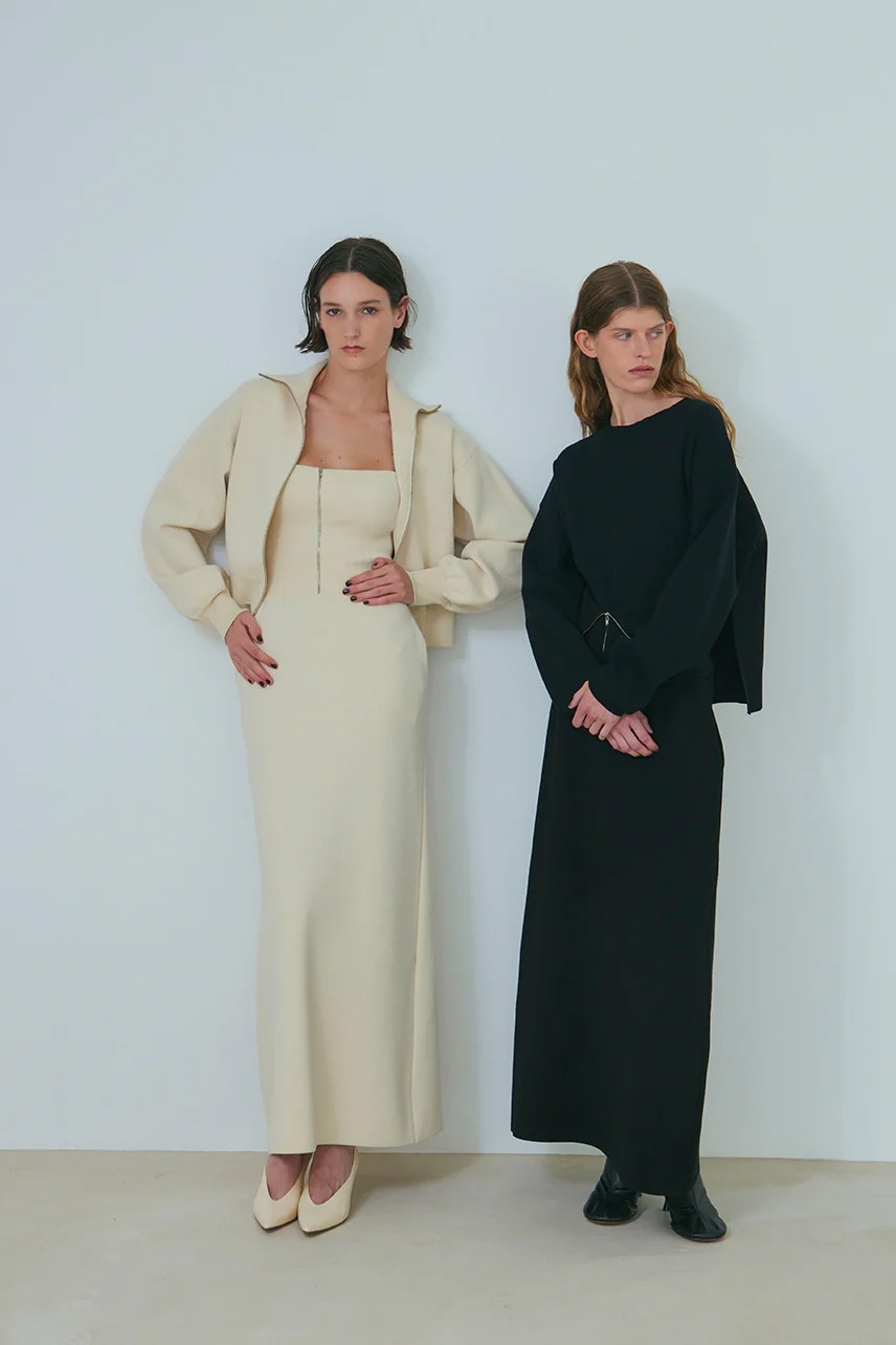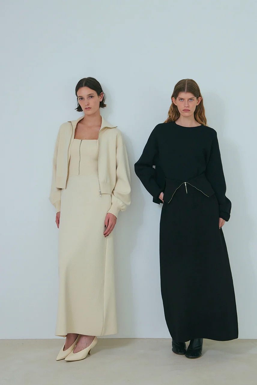 ワンピースをスカートとして着用。プルオーバーのサイドスリットとスカートウエスト部分のフロントジップがポイントに。