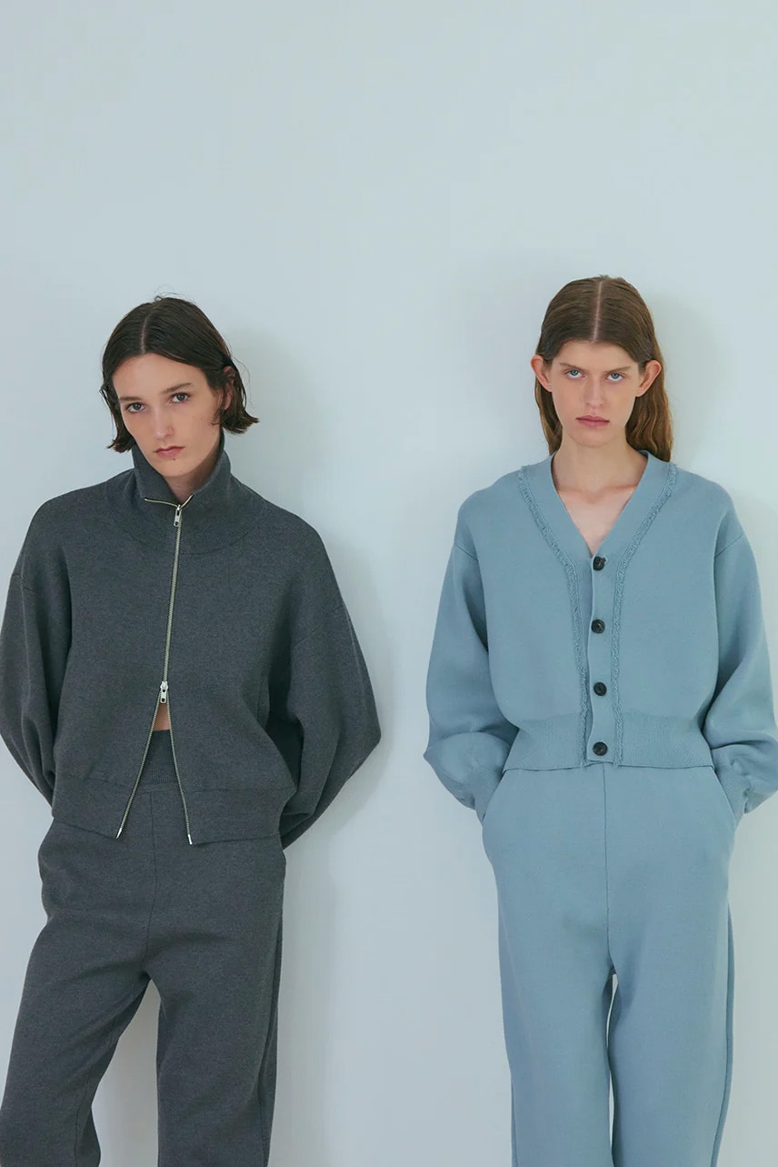 スムースニットシリーズでもっとも人気の組み合わせがこれ。カジュアルでありながら上品な素材感やカーディガンのフリンジ、パンツの裾スリットなどのディテールでモダンに。