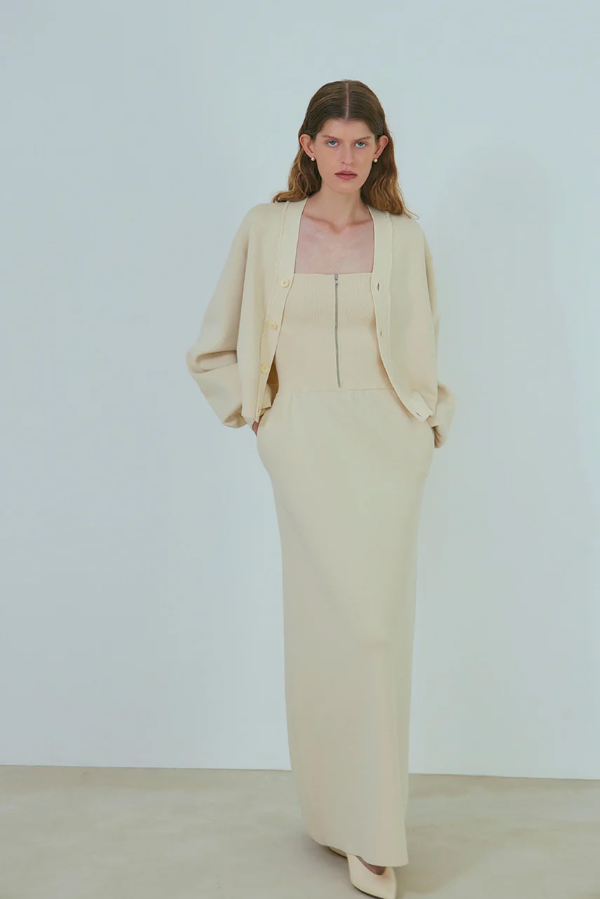 ベアトップワンピースにカーディガンを羽織った、リラックスムードの中にも女性らしさを感じさせるスタイリング。ワンピースはカジュアルドレスアップのシーンでも活躍します。