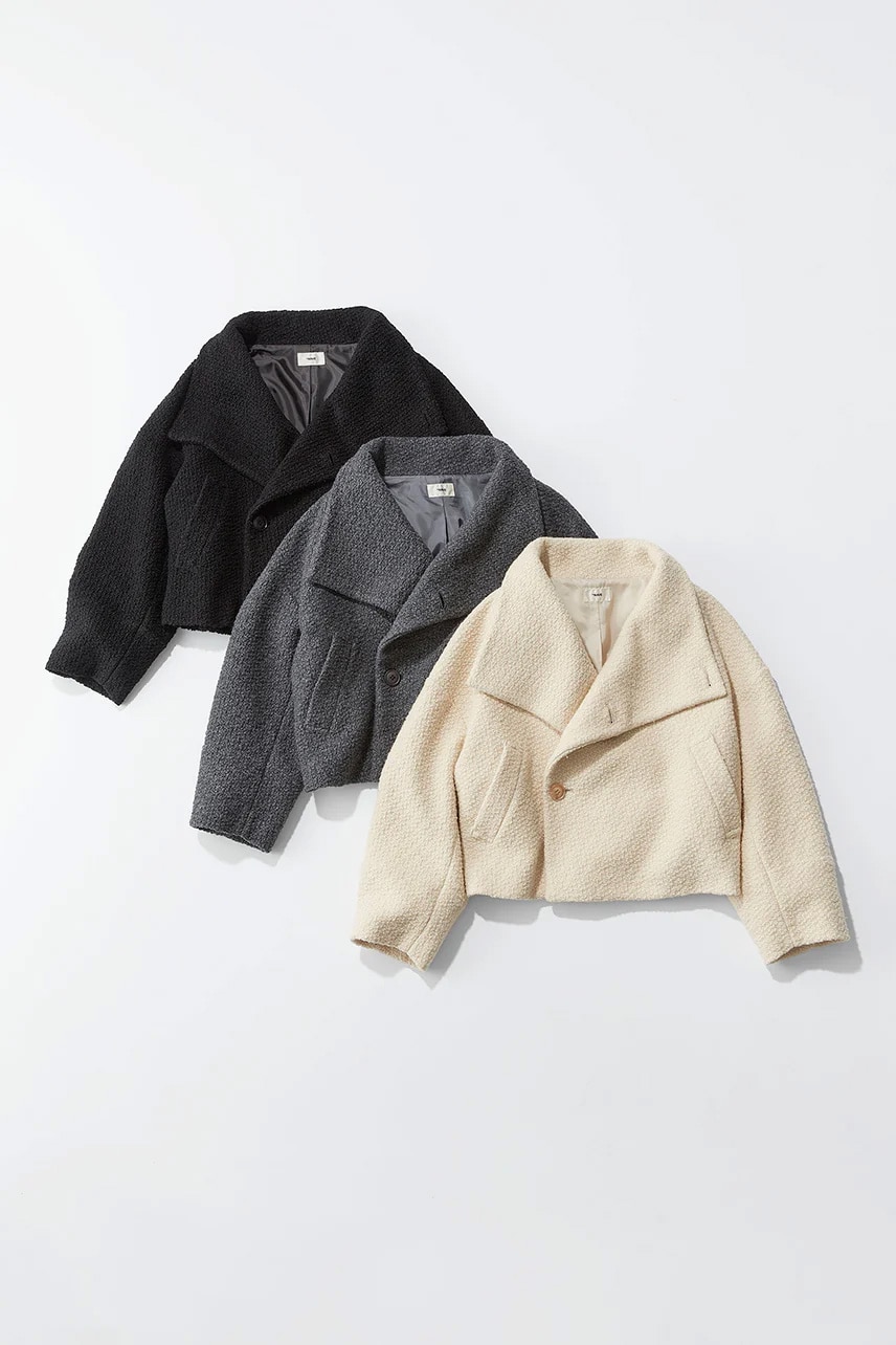 ブークレー素材のぽこぽことした表面感とたっぷりとした襟が印象的。襟もとは上までボタンを留めればスタンドカラーに、前を開ければ大きな襟になり、雰囲気ががらりと変わるのでコーディネートに応じてアレンジを楽しむことができます。ウール混の編み地で空気をふんわり含んでおり、軽いのに暖かいのもうれしい。