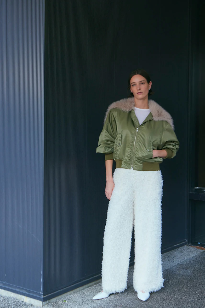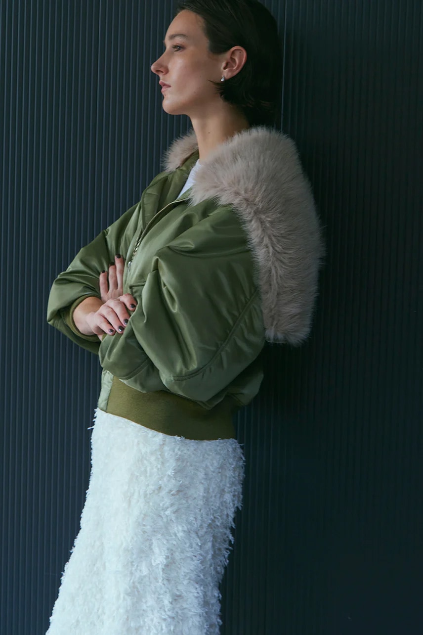 上品な光沢感が特徴の、しっかりとした肉厚なナイロンツイル素材で仕立てたMA-1ジャケット。フェイクファーをたっぷりとあしらった大きめの襟は取り外しが可能。さらにファスナーを閉じればフードにもなるマルチWAY仕様。コンパクトな着丈とボリューム感のある袖のバランスが、ひとさじの女らしさをトッピングしてくれます。