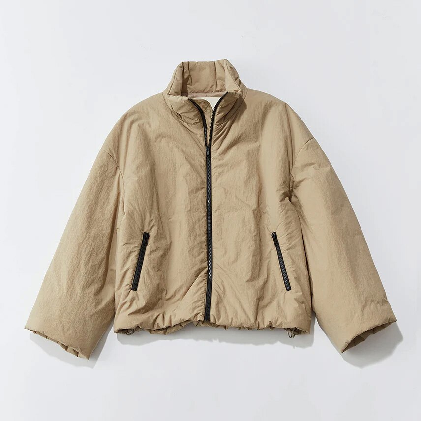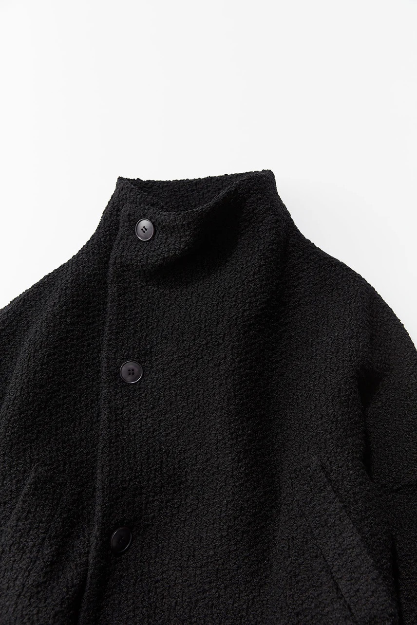 ボリュームたっぷりな襟は、ボタンを上まで留めるとマニッシュなスタンドカラーに。雰囲気ががらりと変わるのはもちろん、首もとまでしっかり包むので、防寒機能としても見逃せません。