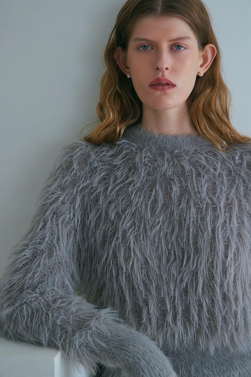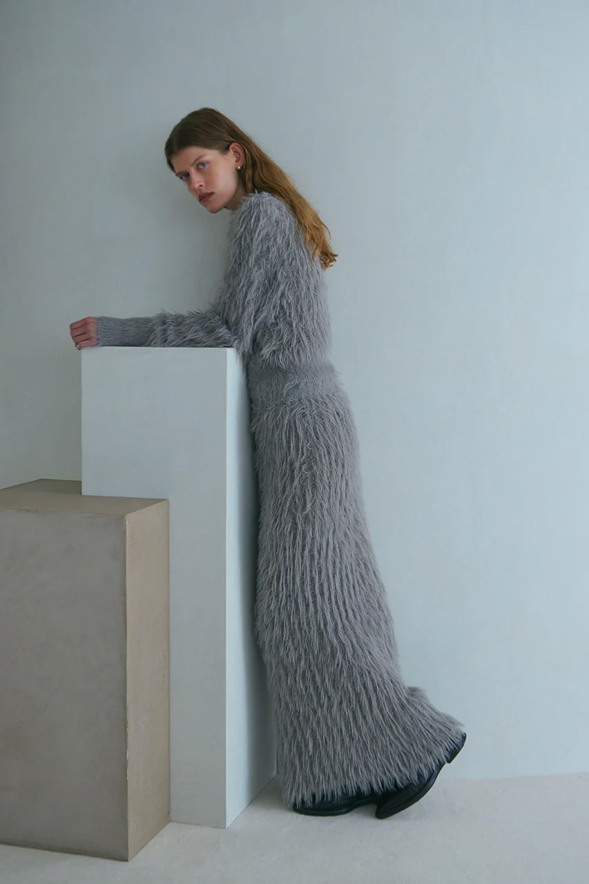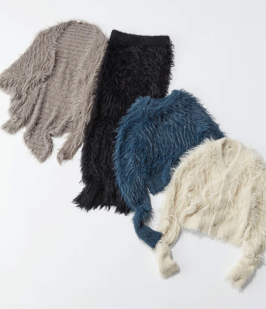 カーディガンとスカートをセットアップで。毛足の長いシャギー素材のおかげでシンプルになりすぎず、パッと目を惹く華やかさと存在感が際立ちます。ナイロン素材ならではのふわふわしっとりとした肌触りが気持ちよく、デイリーはもちろん、旅行などのシーンでも重宝します。
