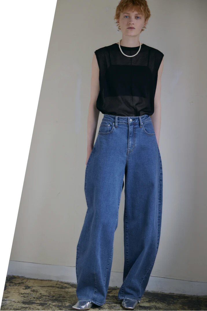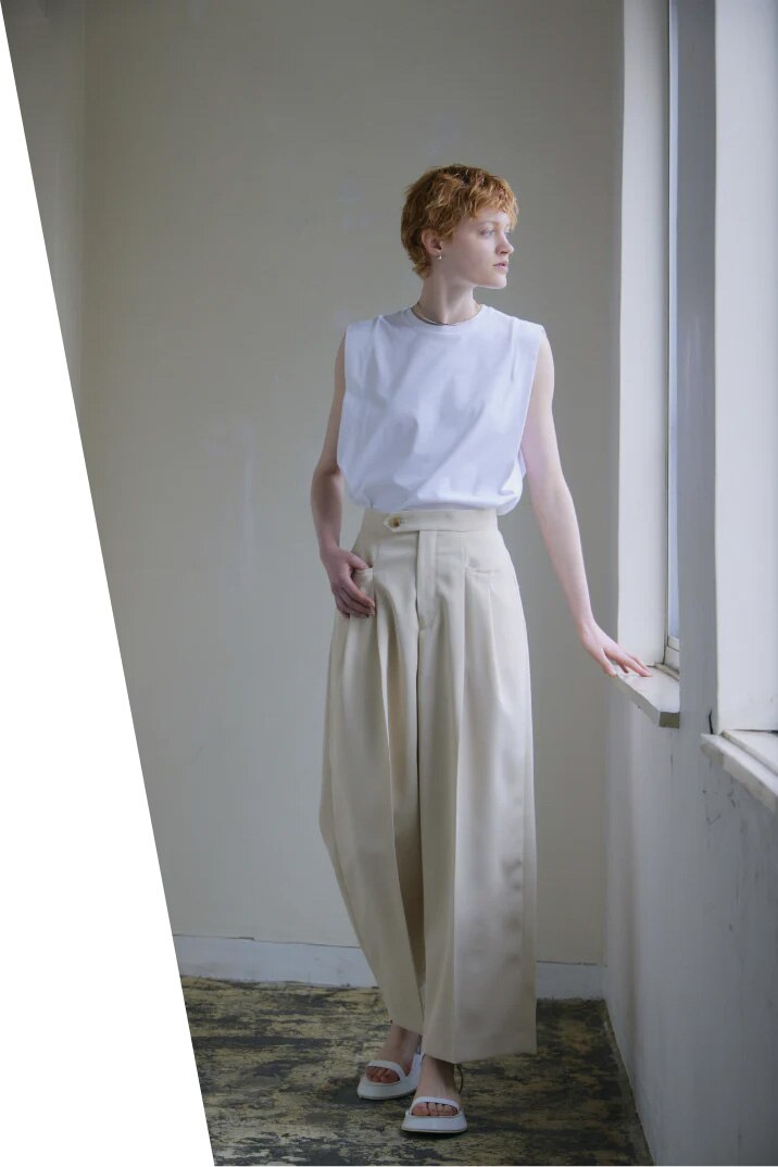 ウエストまわりはすっきりさせつつ、ポケットから立ち上がるタックを入れることで腰回りにゆとりが生まれてヒップがすっきり見える仕立て。ワイド幅がちょうどよく、トップスインしてもサマになるデザインだから、トップス次第でオフィスからカジュアルまでさまざまな着こなしに対応。適度にハリのある軽やかな素材を使っており、シーズンレスで使えます。
