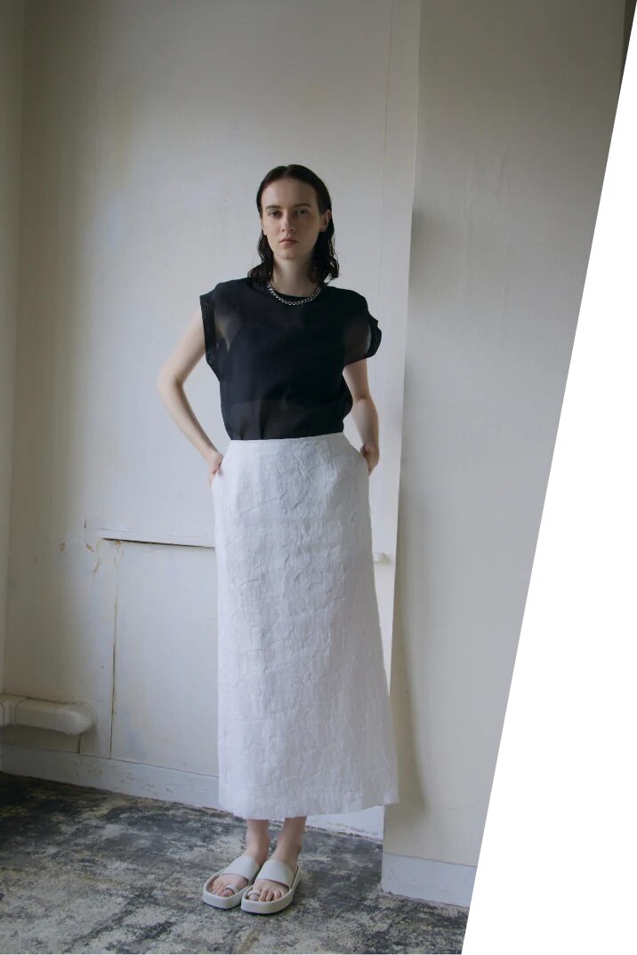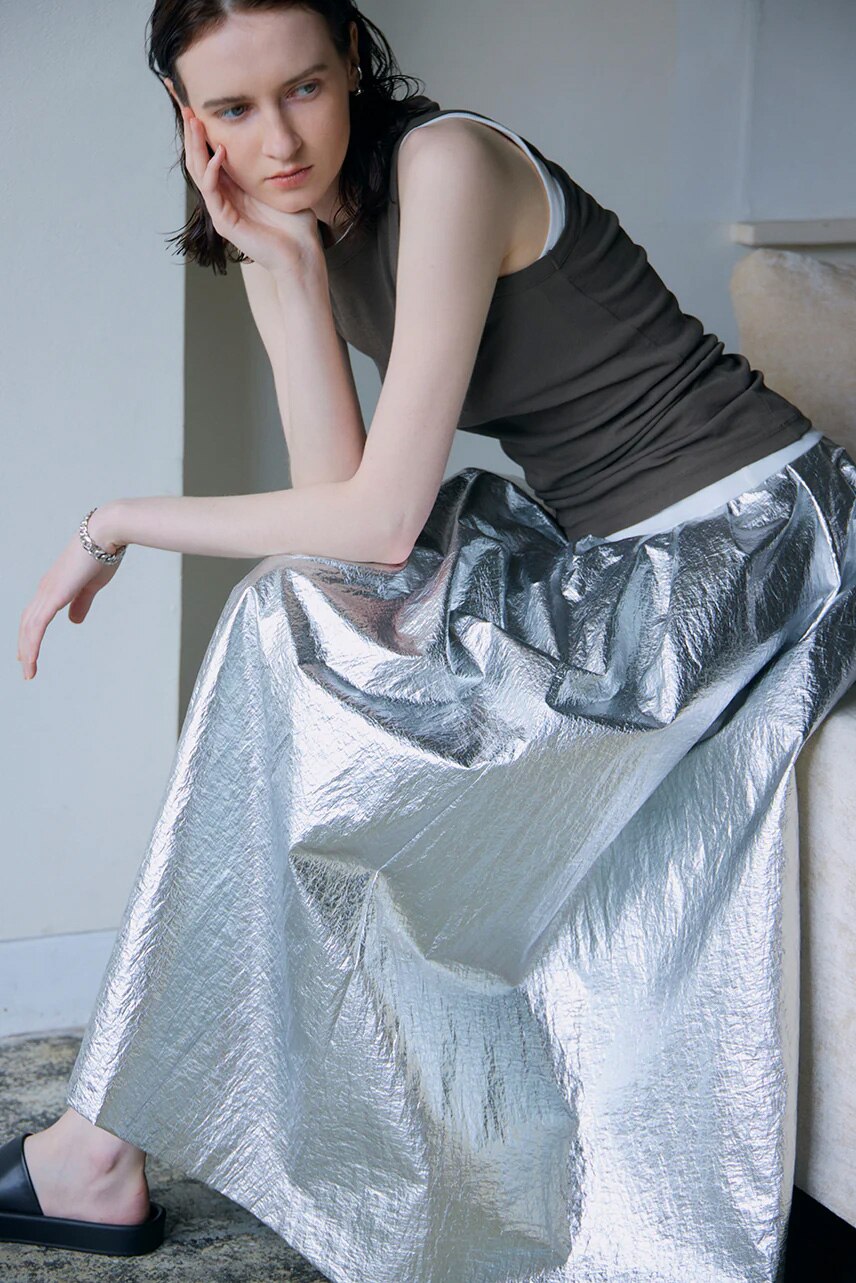 オーガンジー素材にワッシャー(シワ)加工を施し、さらに箔をプラスしたシーズンムードたっぷりなスカート。ふんわり立体的に広がる構築的なシルエットが抜群の存在感を誇ります。タンクトップやTシャツなどのカジュアルアイテムを合わせた、リラックス感のあるスタイリングがおすすめ。