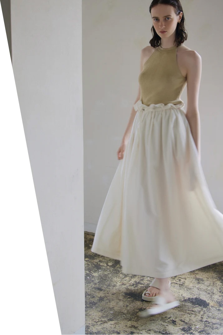 ギャザー部分にランダムにタックを入れ、ウエスト部分に立ち上がりを作ることでシンプルなフレアスカートのアクセントに。ウエストはドローコード仕様なので、シルエットの調節ができます。トップスインしたときにも、ウエストデザインのおかげでバランス良く決まるのが魅力。揺れるフレアーが軽やかな着こなしを演出します。