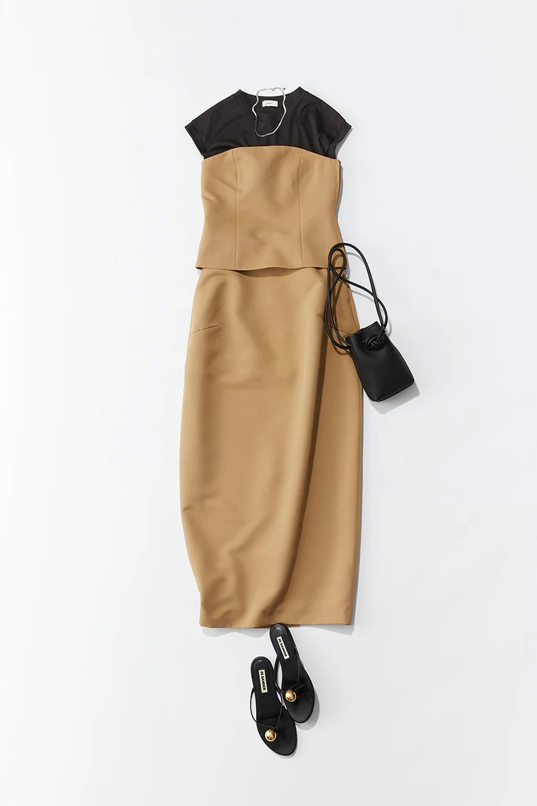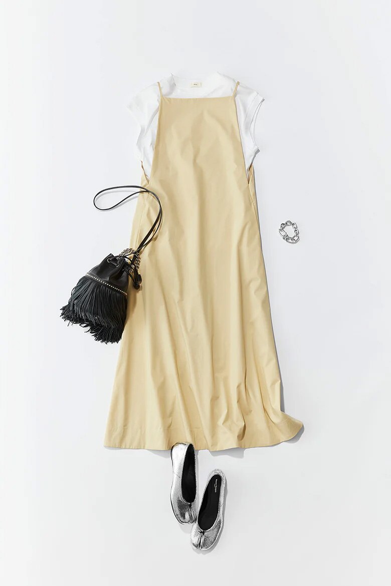 従来のTシャツワンピースというと、カジュアルすぎたりほっこりしすぎたりで、“大人のおしゃれ着”として着こなすのが難しいものが多かったように思います。私自身もTシャツワンピースはどちらかというと苦手だったくらい(笑)。この素材にはハリ感とほんのり光沢感があって、Tシャツワンピースならではのリラックスムードはありつつ、決してだらしなくならないのがポイント!小物合わせでアレンジしながら、おしゃれに着こなすことができると思います。