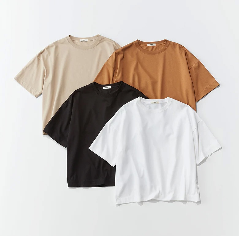 しなやかで優しい肌ざわりのインド綿を使用し、なめらかな加工を施すことでハリ感をもたらしきれいめ印象に。さらっとした肌離れの良さが特徴で、真夏までノーストレスで着こなすことができます。