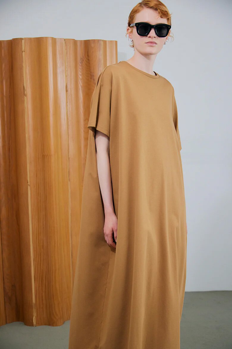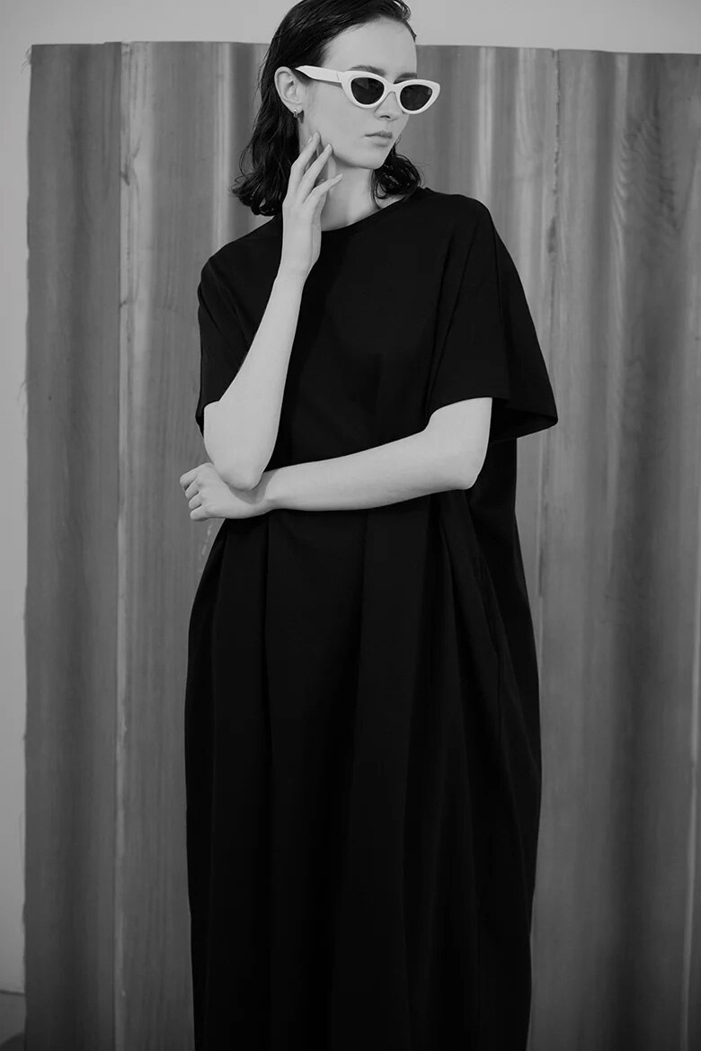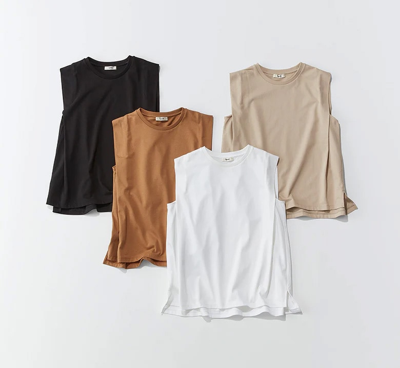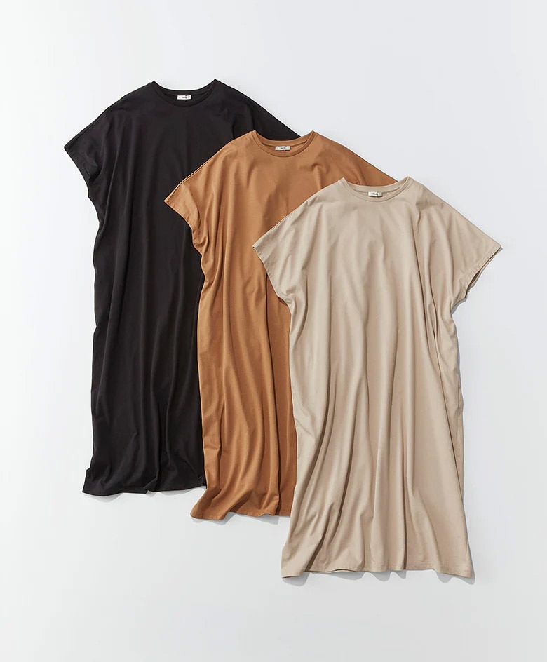 今シーズンから新たに登場したデザインがこのノースリーブ。大人が無理なく着られるように袖部分にテクニックをプラスし、気になるパーツのお悩みをデザインでカバーできるようにしています。素材に適度なハリがあるので、どこから見ても美しい立体シルエット沢感があって、Tシャツワンピースならではのリラックスムードはありつつ、決してだらしなくならないのがポイント!小物合わせでアレンジしながら、おしゃれに着こなすことができると思います。