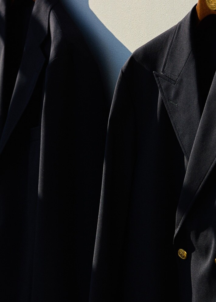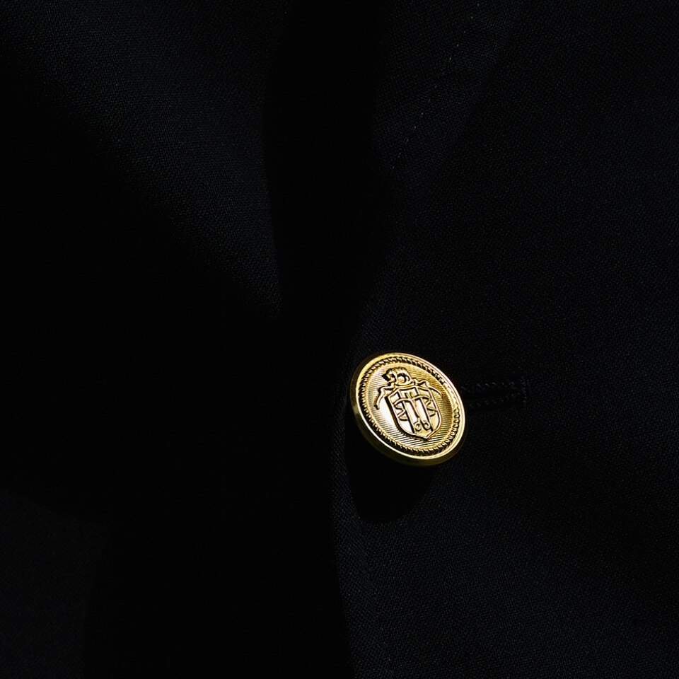 美しい装飾が目を惹く金釦は、ブレザーにとって欠かせない意匠。パッチ&フラップポケットや深めのVゾーン、絶妙な色合いの濃紺生地など、いつの時代でも色褪せないアイコニックさも健在です。