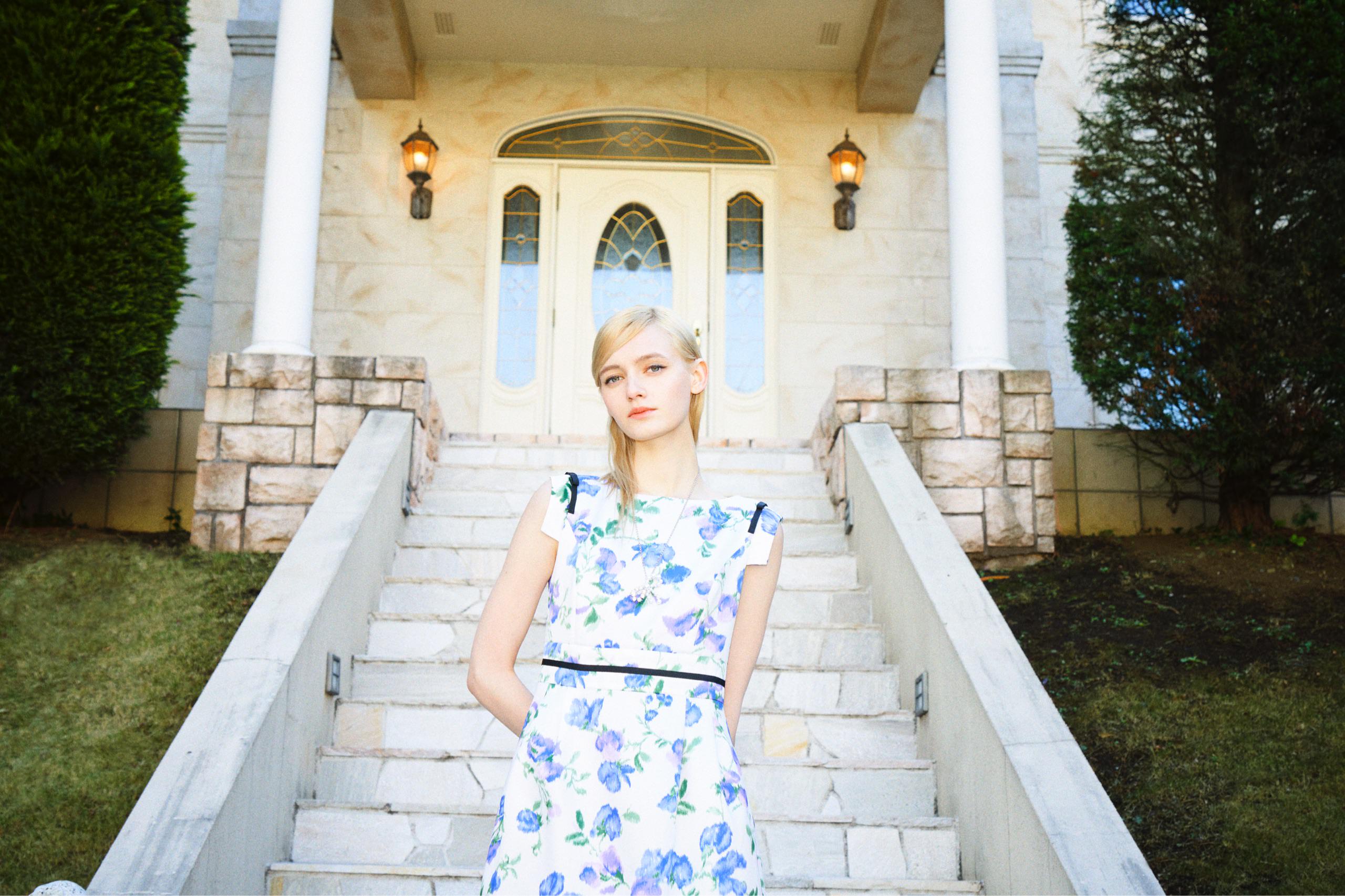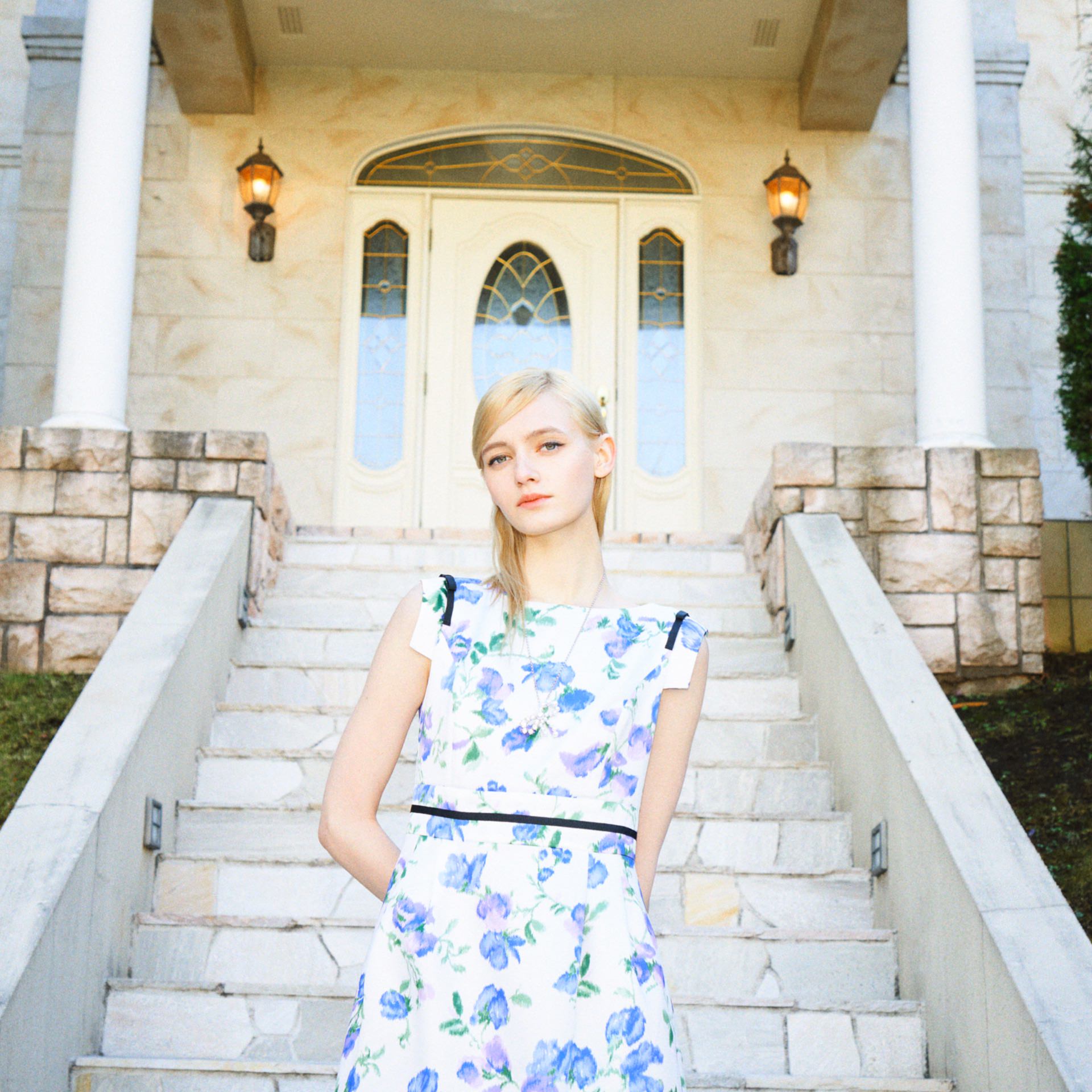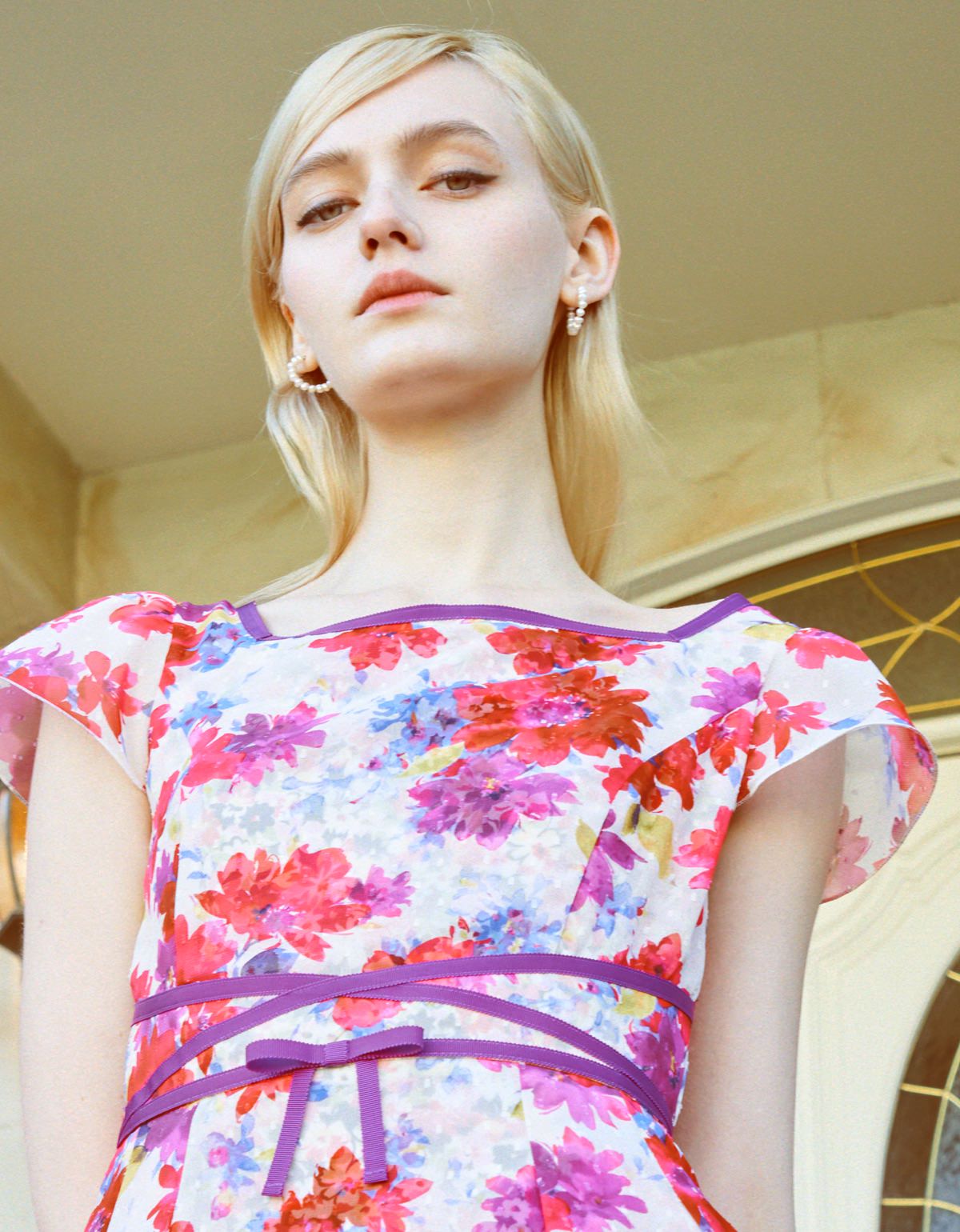 水彩画タッチのフラワープリント。2つの柄が溶け合って一つのドレスが