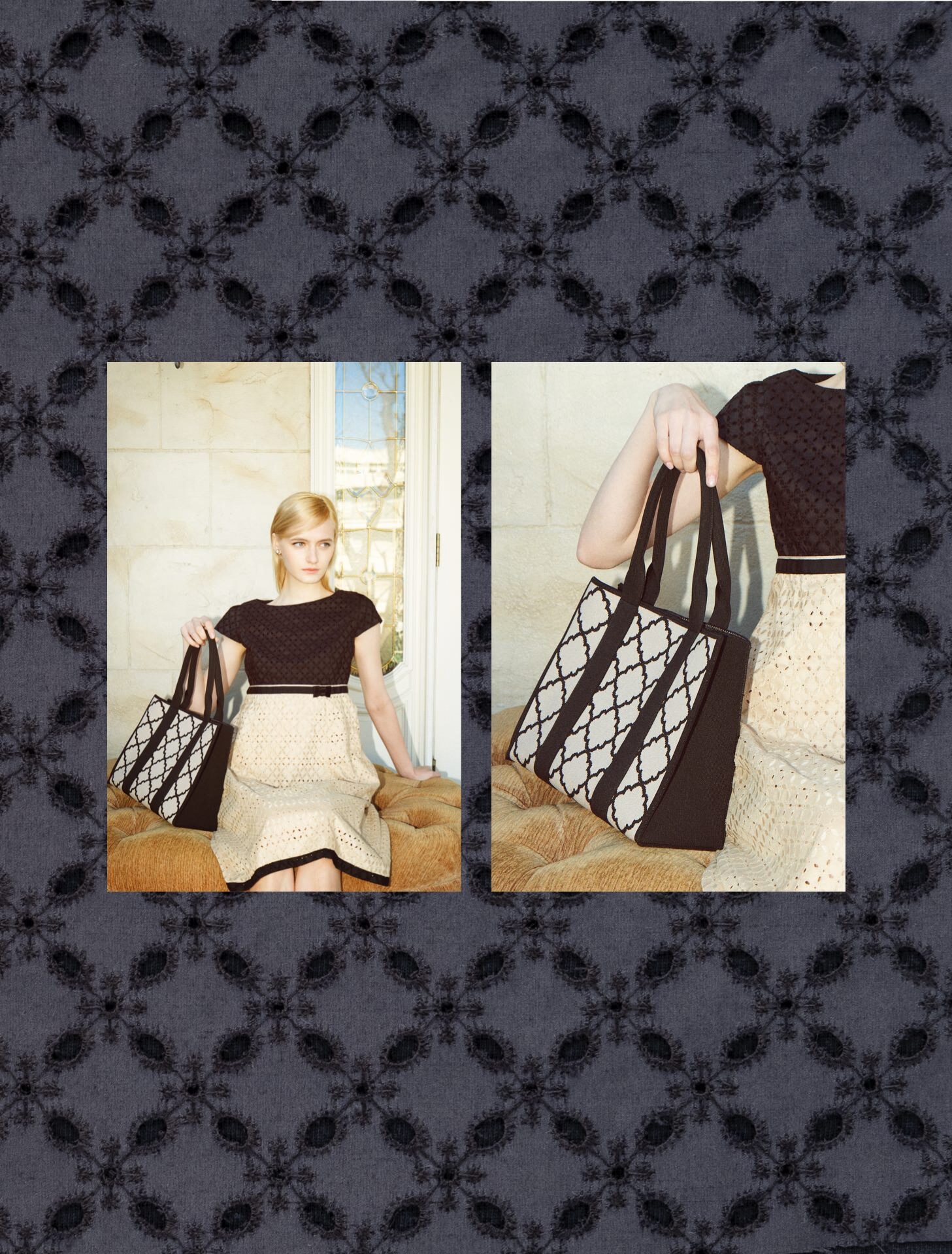 アイコンのクローバーパターンをフィーチャーしたニットバッグ。