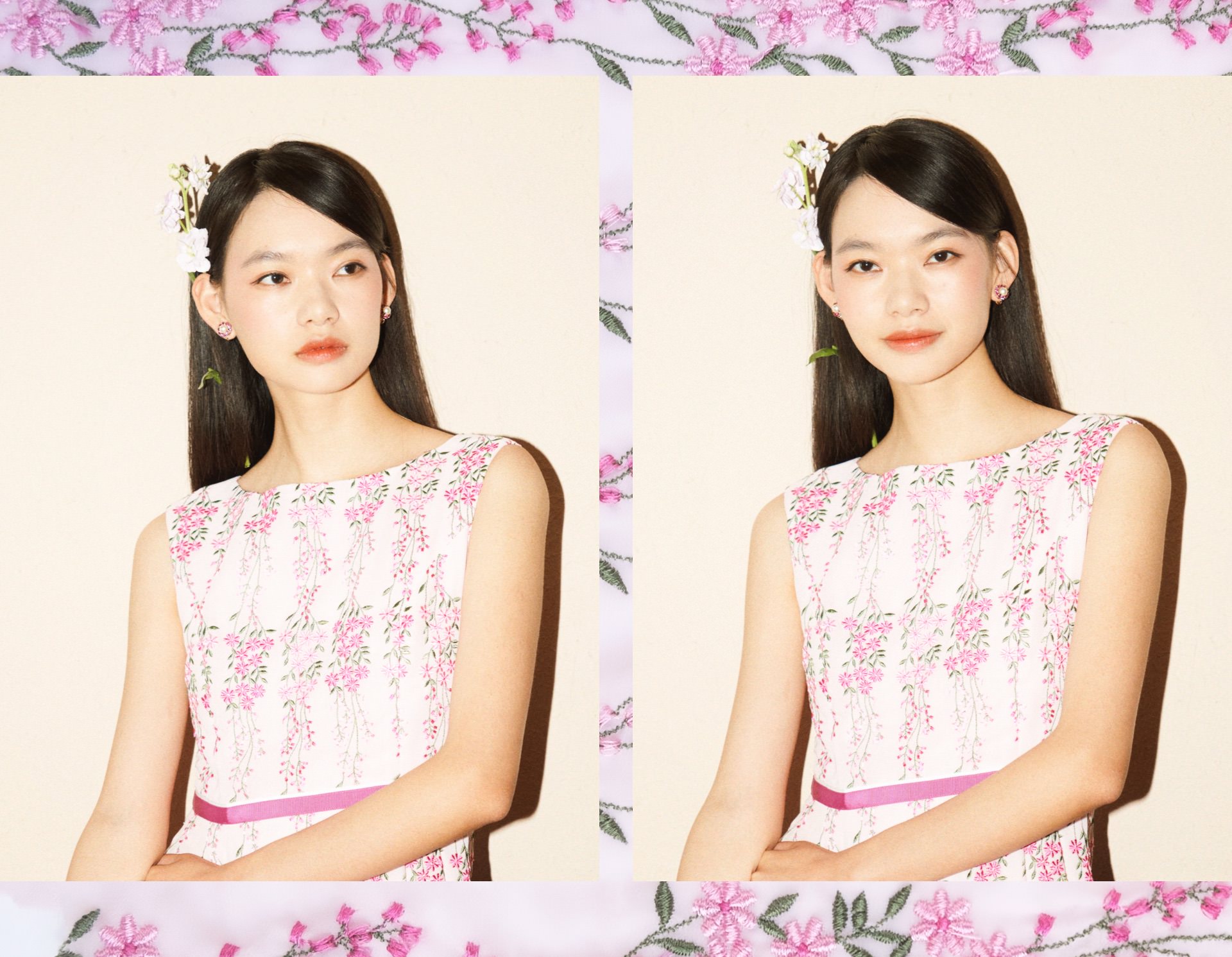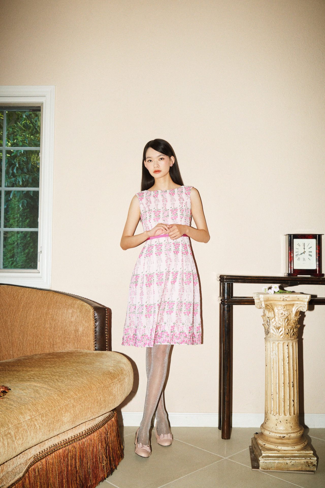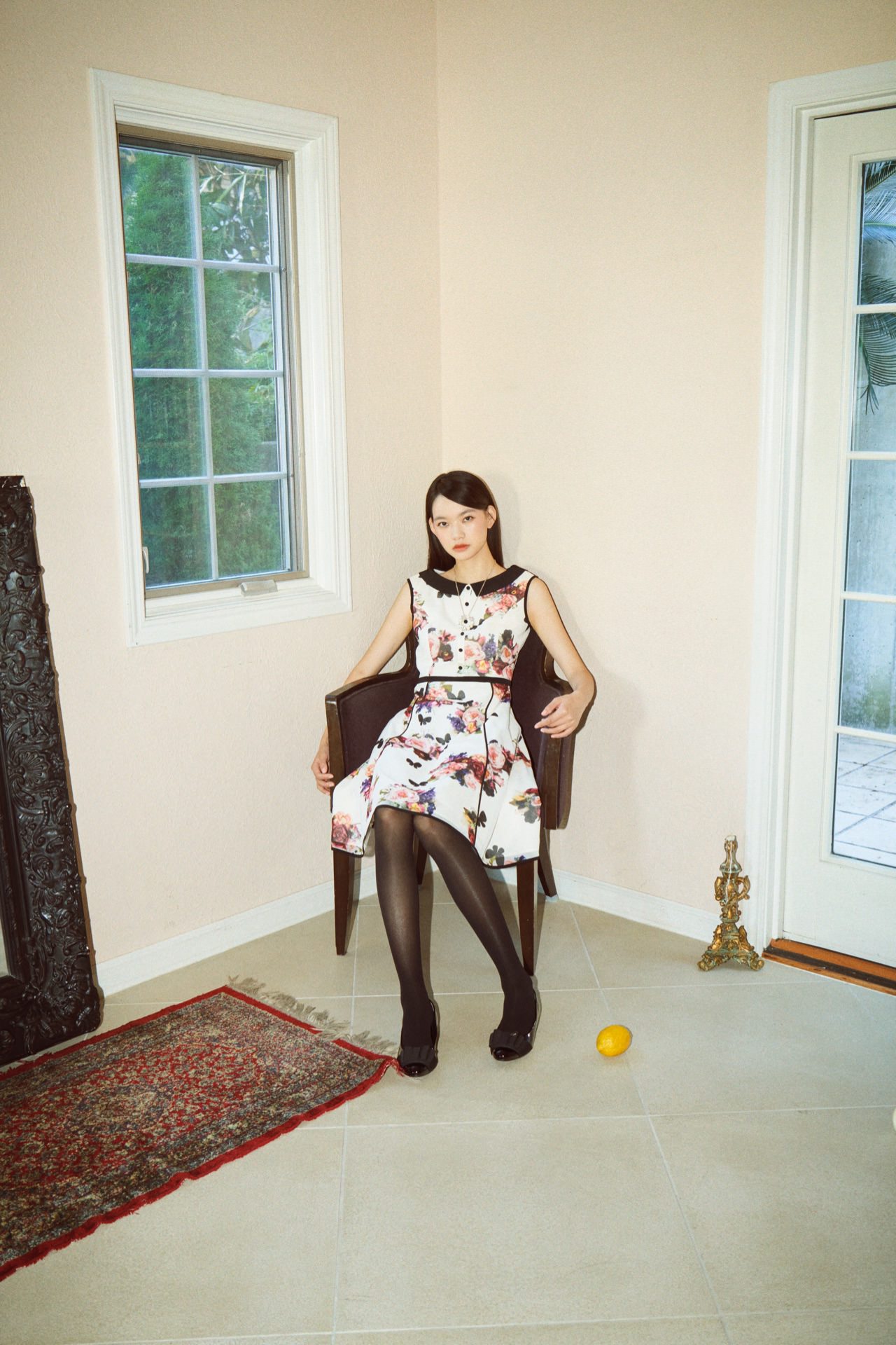 コサージュで有名なアトリエ染花とコラボレーションしたドレス。軽やかなシフォンにコサージュをプリントして、バタフライがコサージュフラワーの合間を舞うデザイン。襟があるデザインなので、きちんとした場面にもおすすめです。