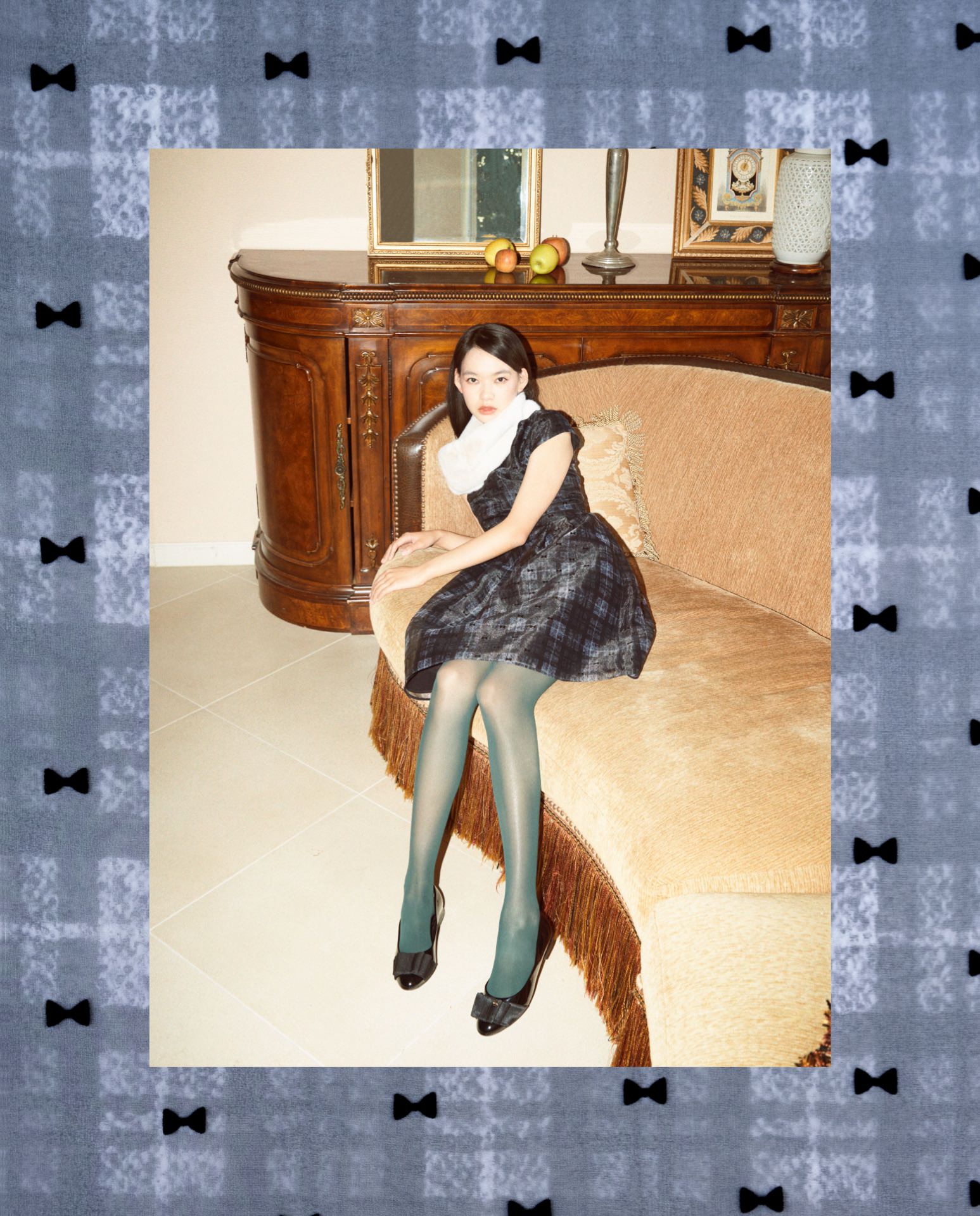 オーガンジーのエレガントさとフロッキーリボンのキュートさをブラックウォッチのプリントで大人っぽくまとめました。ふんわりしたシルエットがTOCCAらしく可憐な印象です。
