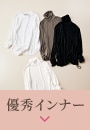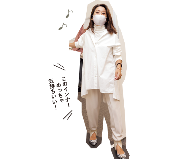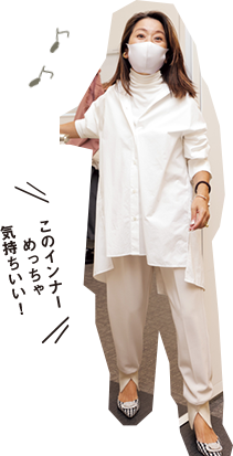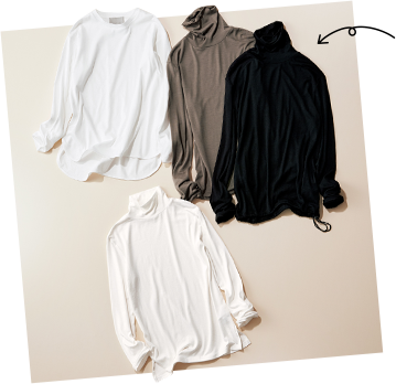 とろけるような着心地が肌に優しいシアバター加工のインナーは、ネックをクシュッと着こなせるのでハイネックが苦手な人にもおすすめです。