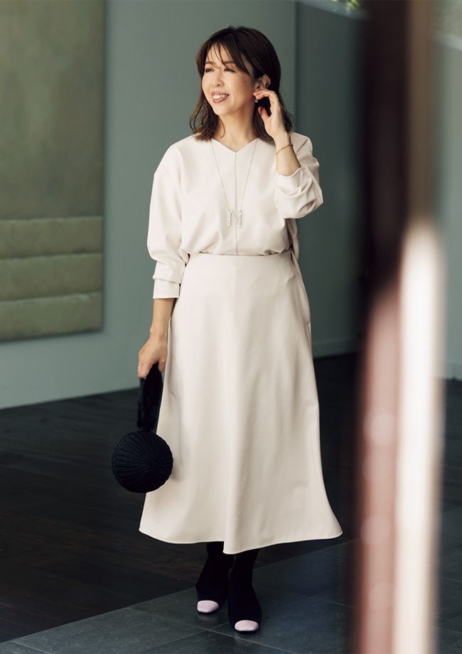 今年の秋冬、注目すべきはスモーキーカラー。発色の良さと、さりげなく女っぽさを演出してくれるティアード風Aラインシルエットが大好評です。 バック、靴、小物/スタイリスト私物