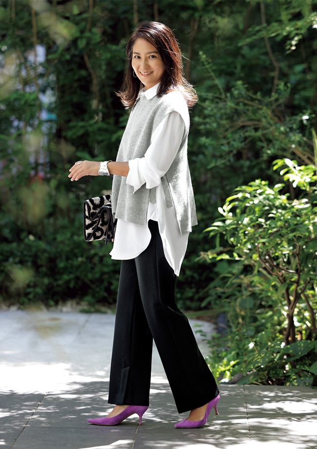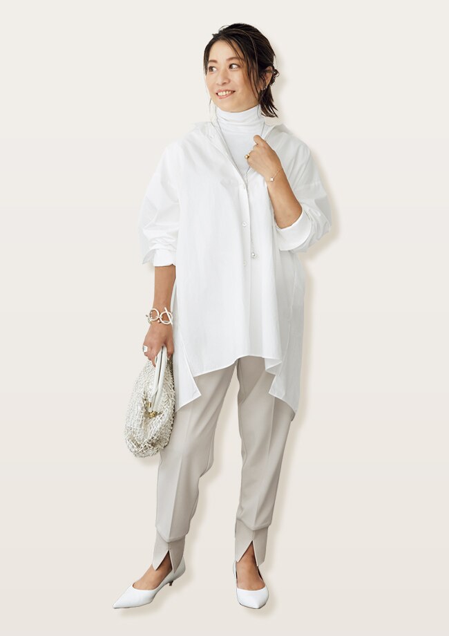 INが苦手な人やバランスによって着こなしのアレンジができる便利な裾ドロストデザイン。ジレのインナーにワントーンコーデでほんのりモードに。 バック、靴、小物/スタイリスト私物