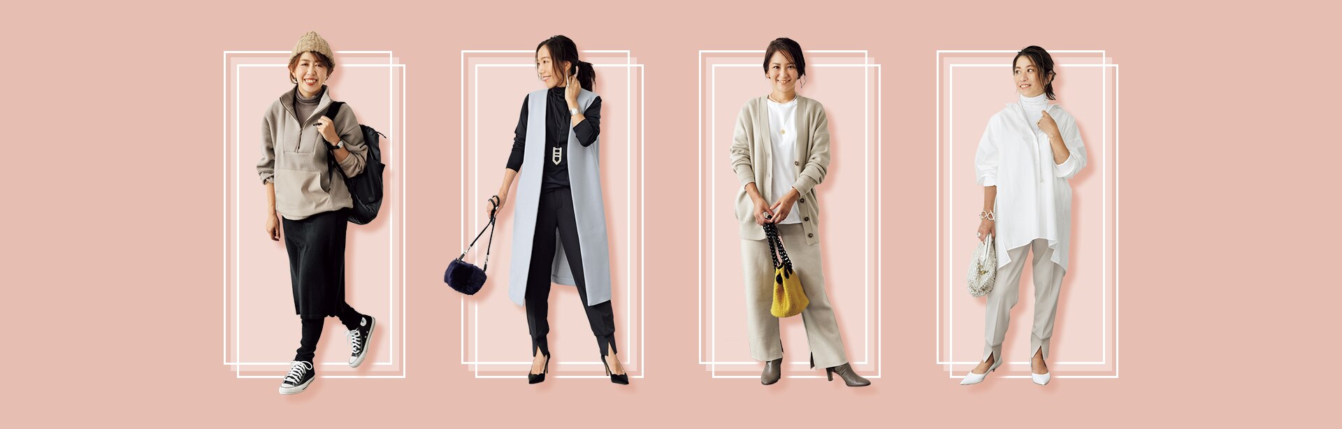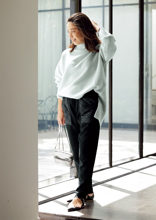 秋のジョグパンに続き、どのサイズ感の人がはいてもスッキリ見えるシルエットが大好評。フロントINできるニットとも相性抜群です。 バック、靴、小物/スタイリスト私物