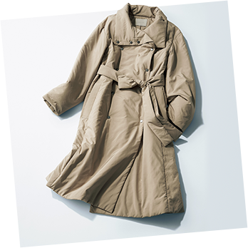 フロントに軽量ダウンを使用。バックフレアのAラインシルエットがほんのり甘さを演出。裾が絞れる2way仕様。