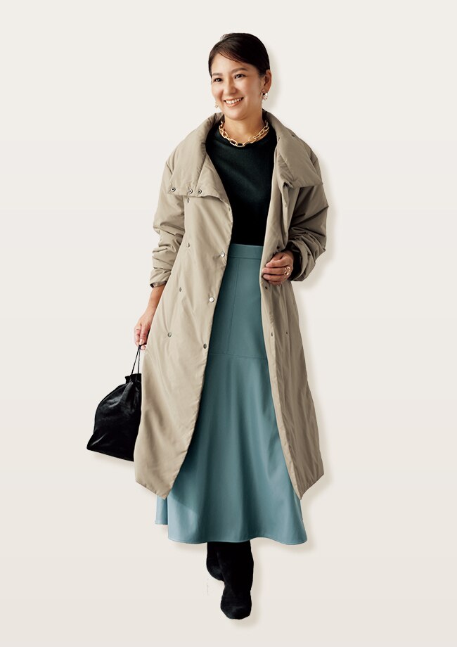 - 「この冬、目をつけていたステッチレスコート。どんな着こなしにも合わせやすいトレンチ型デザインもお気に入りです。」