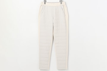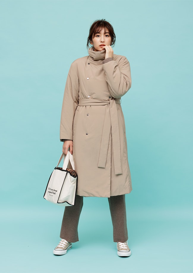 サーモア社の機能性中綿で「薄くて軽くて暖かい」を実現したアウターは、ブラウンをセレクト。ウール見えする上品なニットパンツも同色を投入し、ニュアンシーにまとめて。