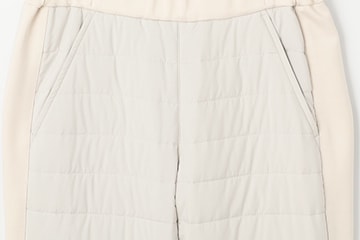 前身は機能性中綿、後身は吸湿発熱の裏起毛ジャージーを使用した寒さに無敵なパンツをリコメンド。裾部分は二重になっており、風が入り込まない仕様に。中綿アウターは黒、ヤクミックスニットはライトグリーンを選んでハンサム仕上げに。