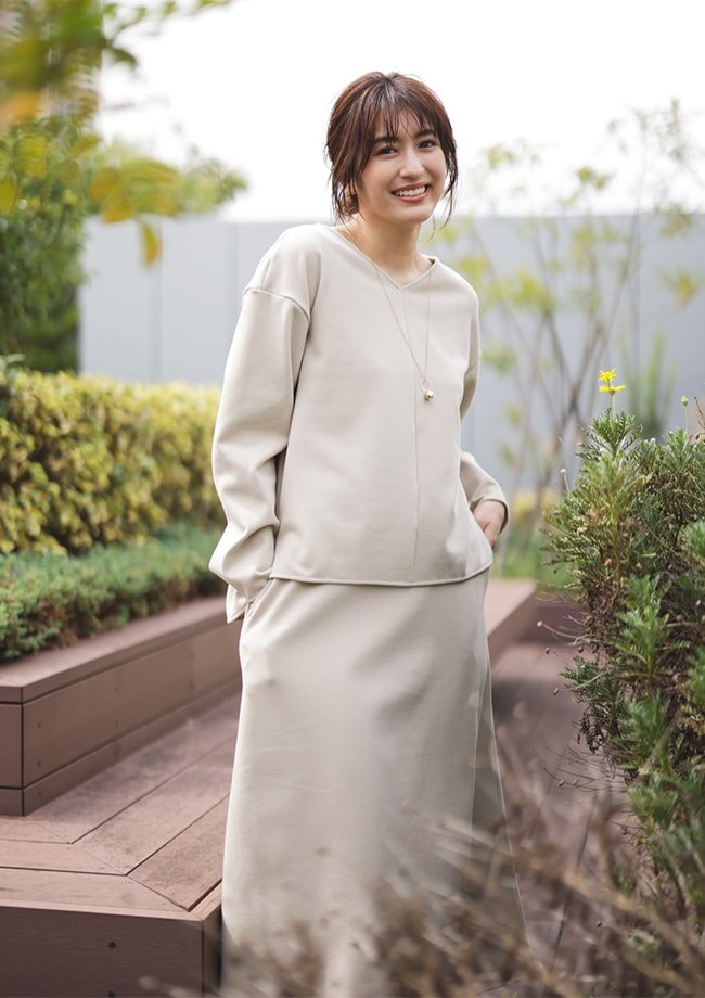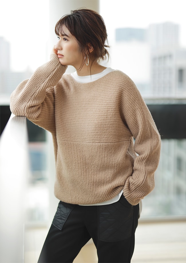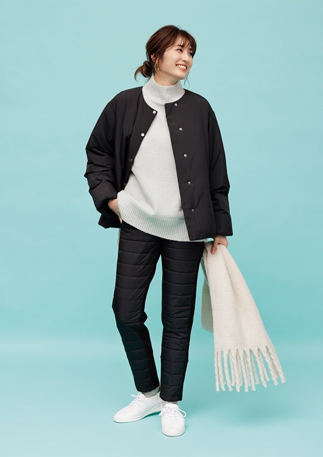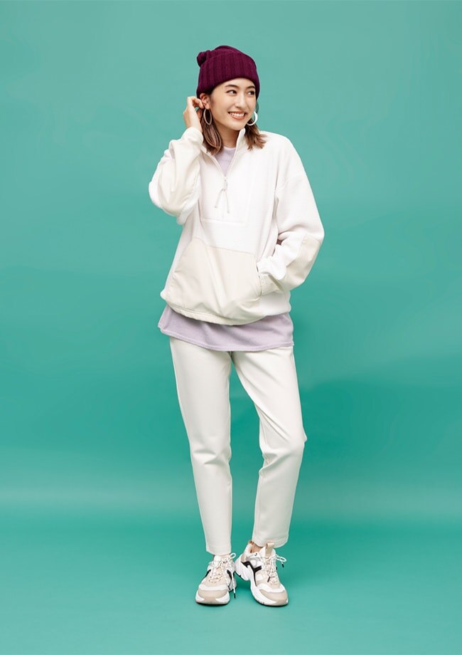 細身の美シルエットが目を引く暖パンとボアのプルオーバーで、アクティブなスタイルに。トップスは中にキレイ色ニットをレイヤードし、寒さ対策とセンスアップを同時に叶えて。