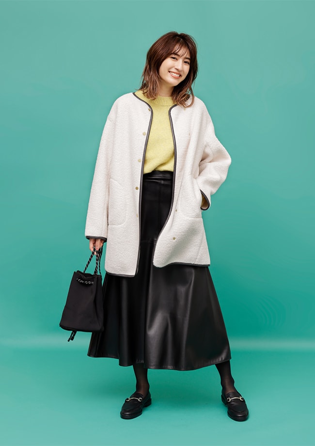 裏面にフリース素材を使ったボアコートは、カジュアルシーンで大活躍すること確実。撥水のエコレザースカートで大人の華感をトッピングすると、“気取らずセンス良く”が手に入ります。