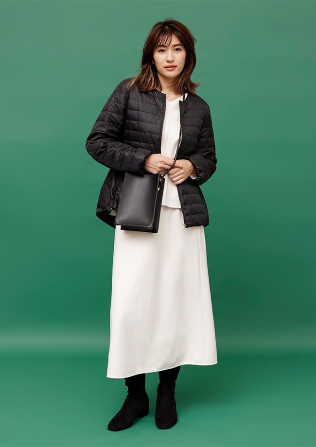 フロントに軽量のダウンを施したショート丈アウターは、軽くて暖かいのが魅力。フリース素材のワンピ見えセットアップを合わせて、「ちょっとそこまで」の外出時も女性らしく。