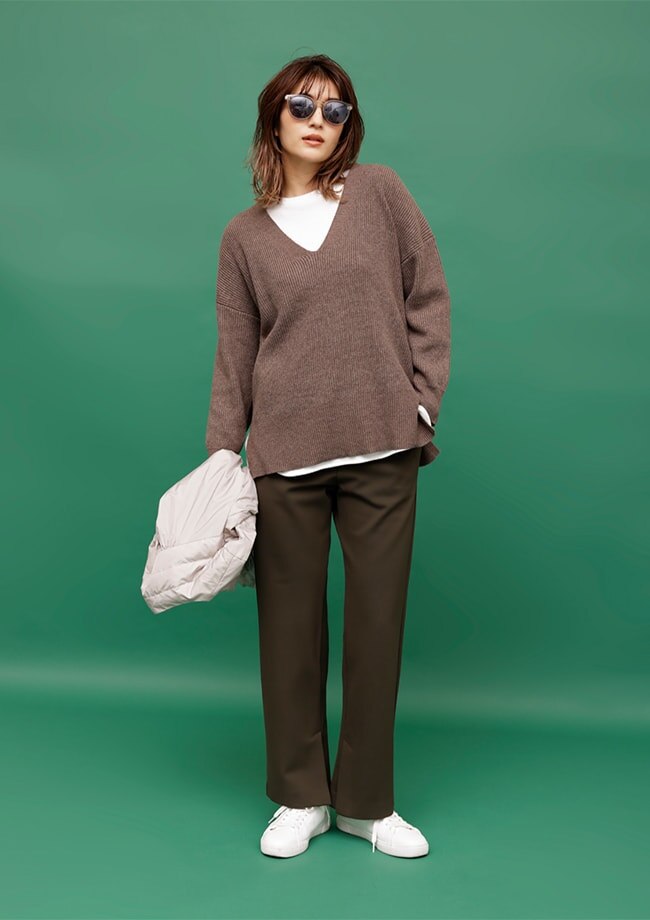キレイにはきこなせるリラクシーなトレンドパンツが主役。ダークブラウン&カーキのこっくりカラーに白を差してリズムを加え、視覚的にも暖かいスタイリングをコンプリート。