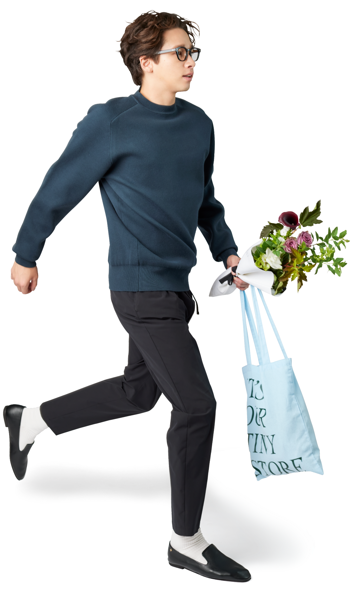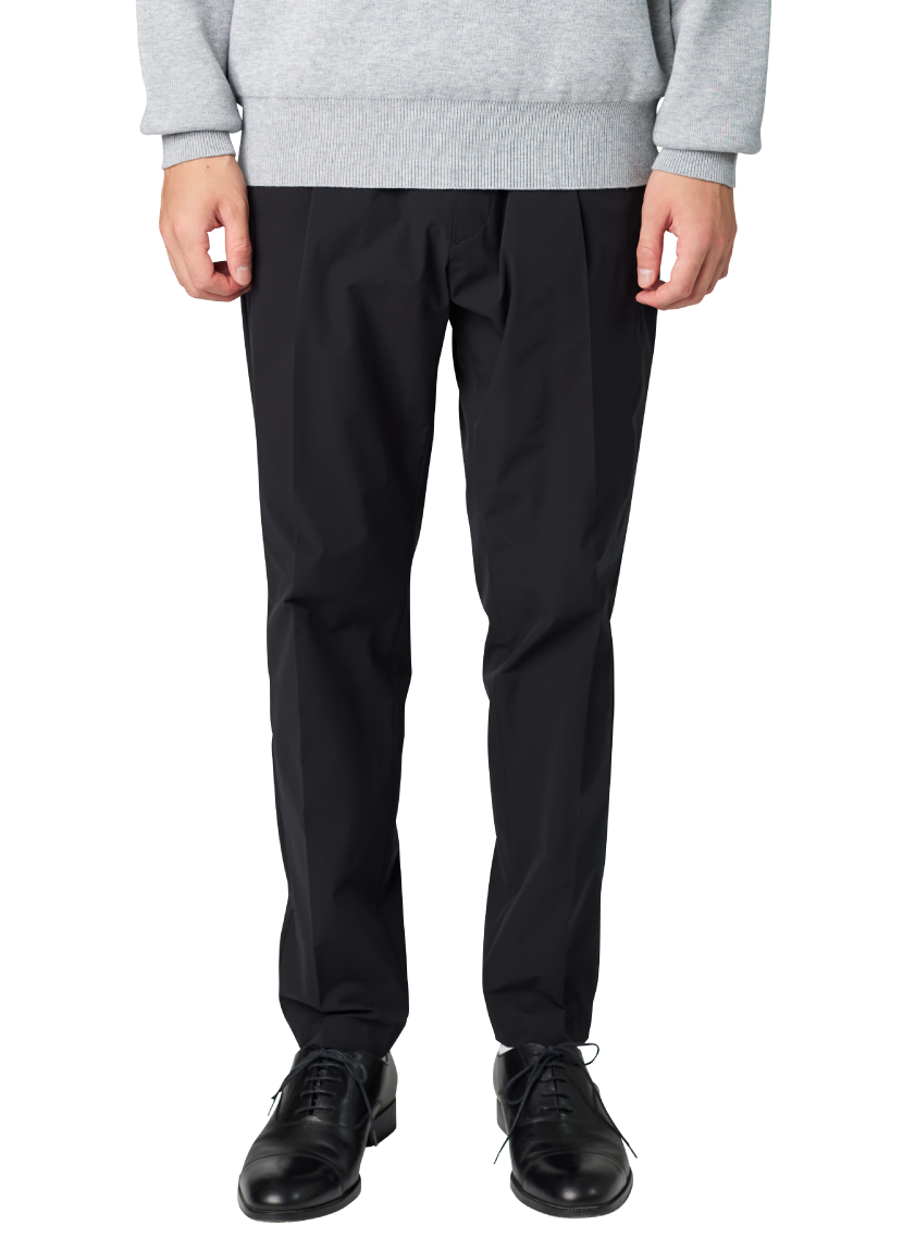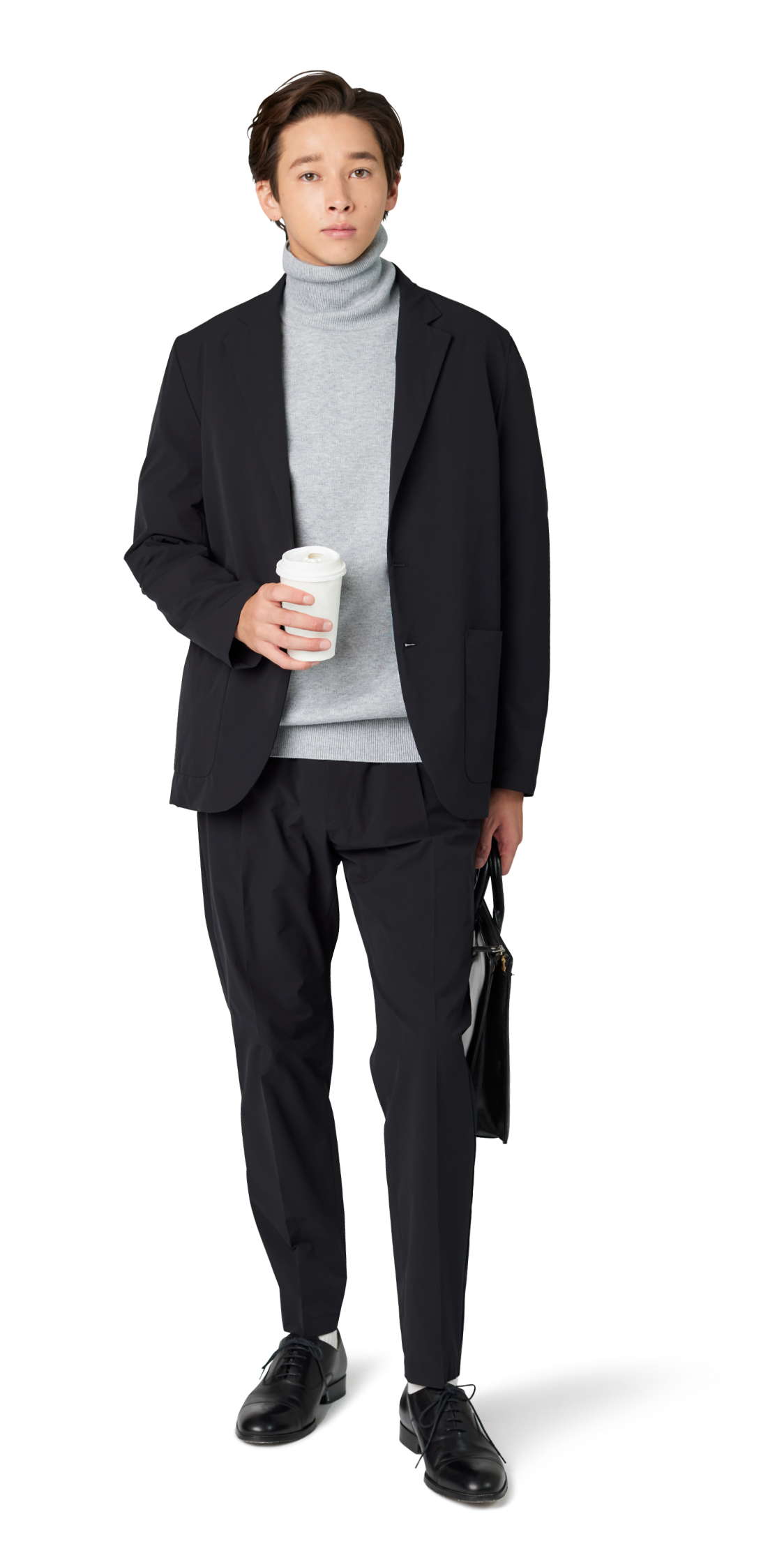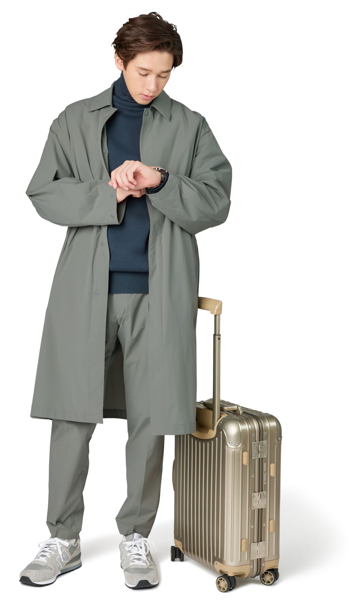 軽さを満喫すべく、FINE MOVEのステンカラーコートとパンツをセットアップでスタイリング。旅行や出張など、立ったり座ったりが多いシーンやトランクにしまうときも、シワを気にせず安心。