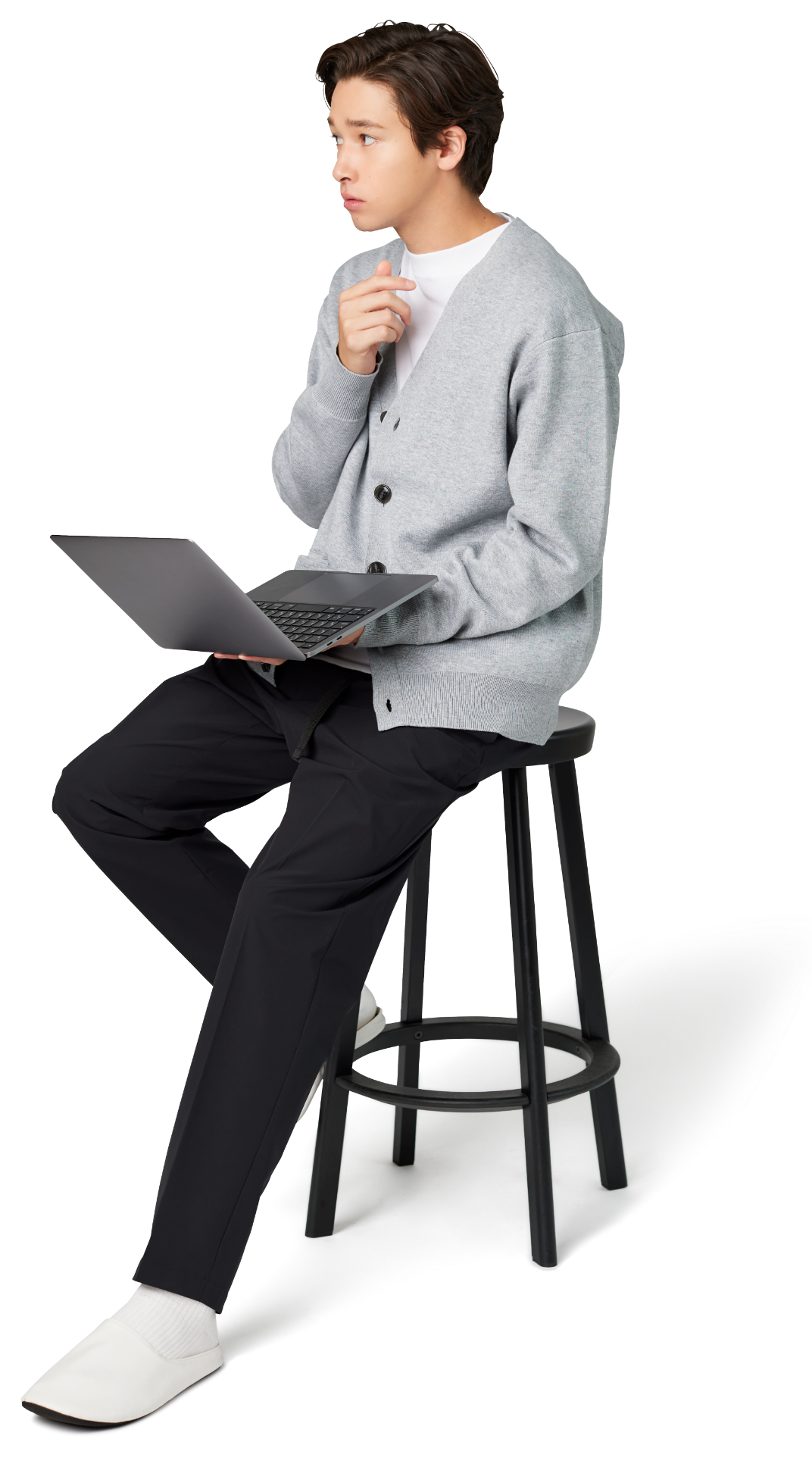快適なリモートワーク生活には、家ならではのリラックス感と、見た目のきちんと感が必要。程よく地厚なVネックカーディガン×テーパードパンツの組み合わせで、ゆるさのあるワークスタイルが完成。