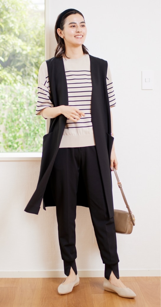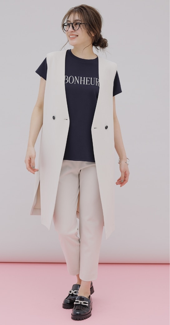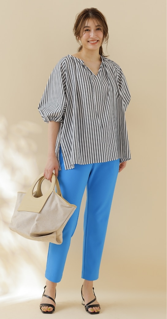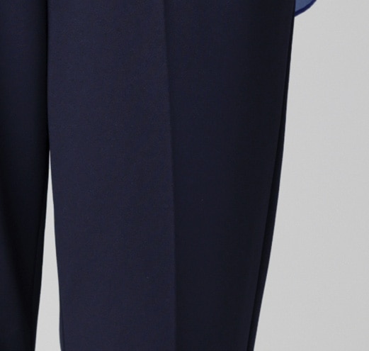 脚を細く、まっすぐに見せるセンタープレスで、きちんとした印象に。