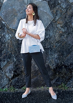 派手過ぎず、品よく肌になじむ流行りのひよこカラーを取り入れて、カジュアルなTシャツスタイルを華やかに。ワンツーコーデがサマになるボリューム感とハリ感も魅力です。
