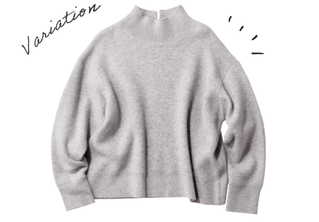 ハイネックニットと同様のカシミヤブレンドは繊細なゲージも魅力のひとつ。体のラインをカバーしながら、ゆったり着られる女性らしい印象のプルオーバーは、首から離れたオフネックと肩回りを包みこむラグランスリーブが華奢見えする1枚です。