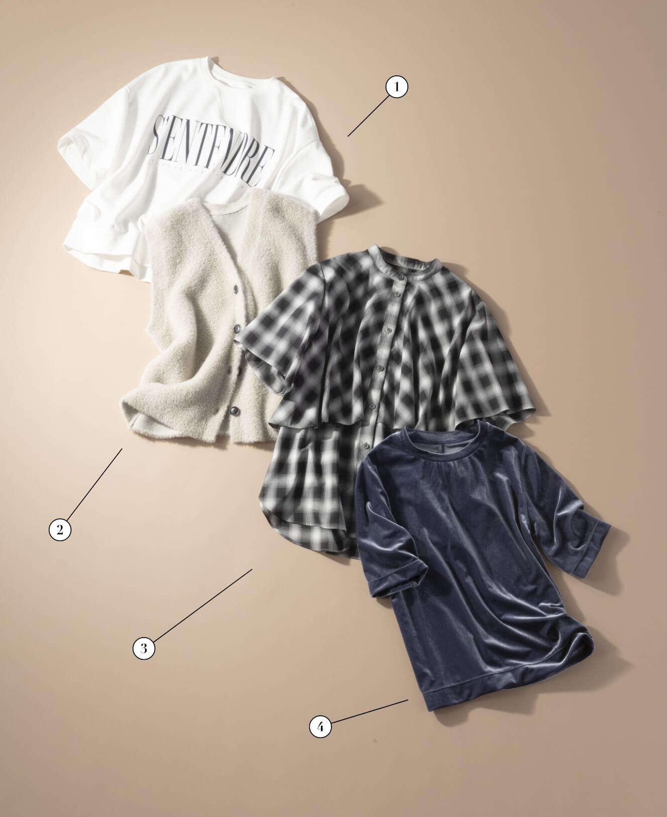秋ムードを演出するのに最適な素材の洗えるベロアは、半袖だから今から長く使える1枚。微光沢で顔周りの華やかさも演出します。