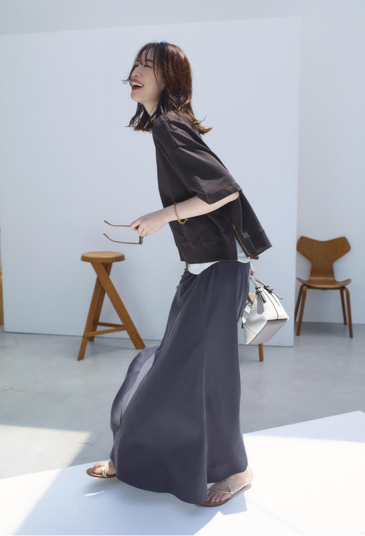 コーデに抜け感を出せるスウェットは身幅の広い短か丈。ウエスト処理に悩まずパッと着るだけでコーデが完成。UVケアで屋外時間が長い日にも重宝します。