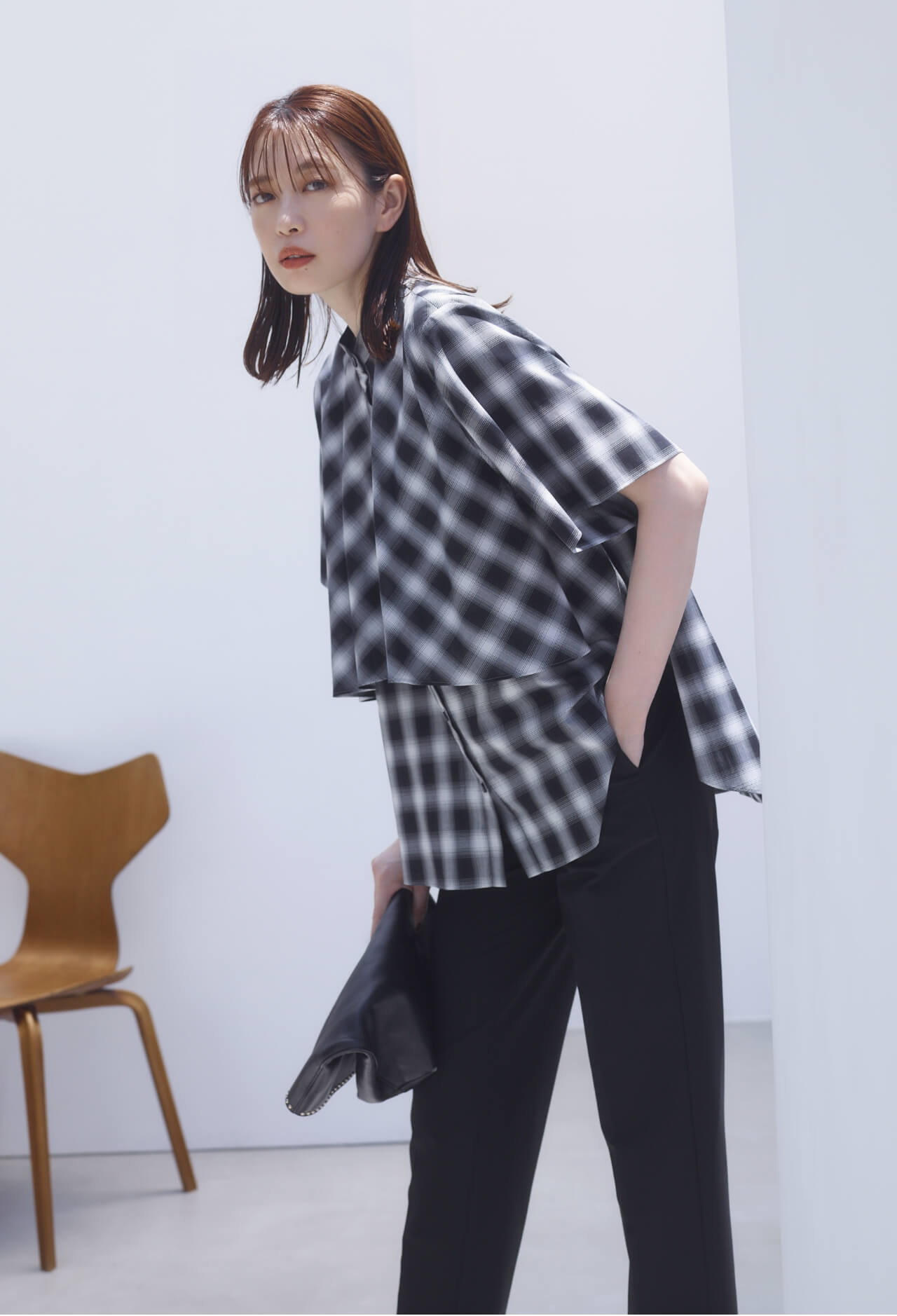 あれこれとコーデを考えなくても、チェック柄のシャツなら手持ちの黒パンツに合わせるだけでスタイリングが完成。サイドスリットや重なりのある切り替えデザインが印象的なトップスで、シンプルコーデでもオシャレ見え。秋めきながら涼しげに着られる1枚です。