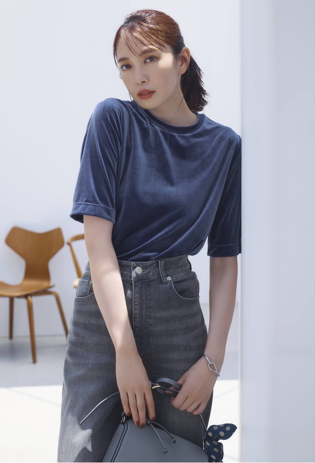 美しくリッチな印象を持つベロア素材はシンプル過ぎると物足りなさを感じる大人の救世主トップス。ストレッチで着心地もよく、品のある煌めきで動く度に表情が出るので、デニム合わせのワンツーコーデでもオシャレ感抜群。二の腕が出ない五分丈も魅力です。