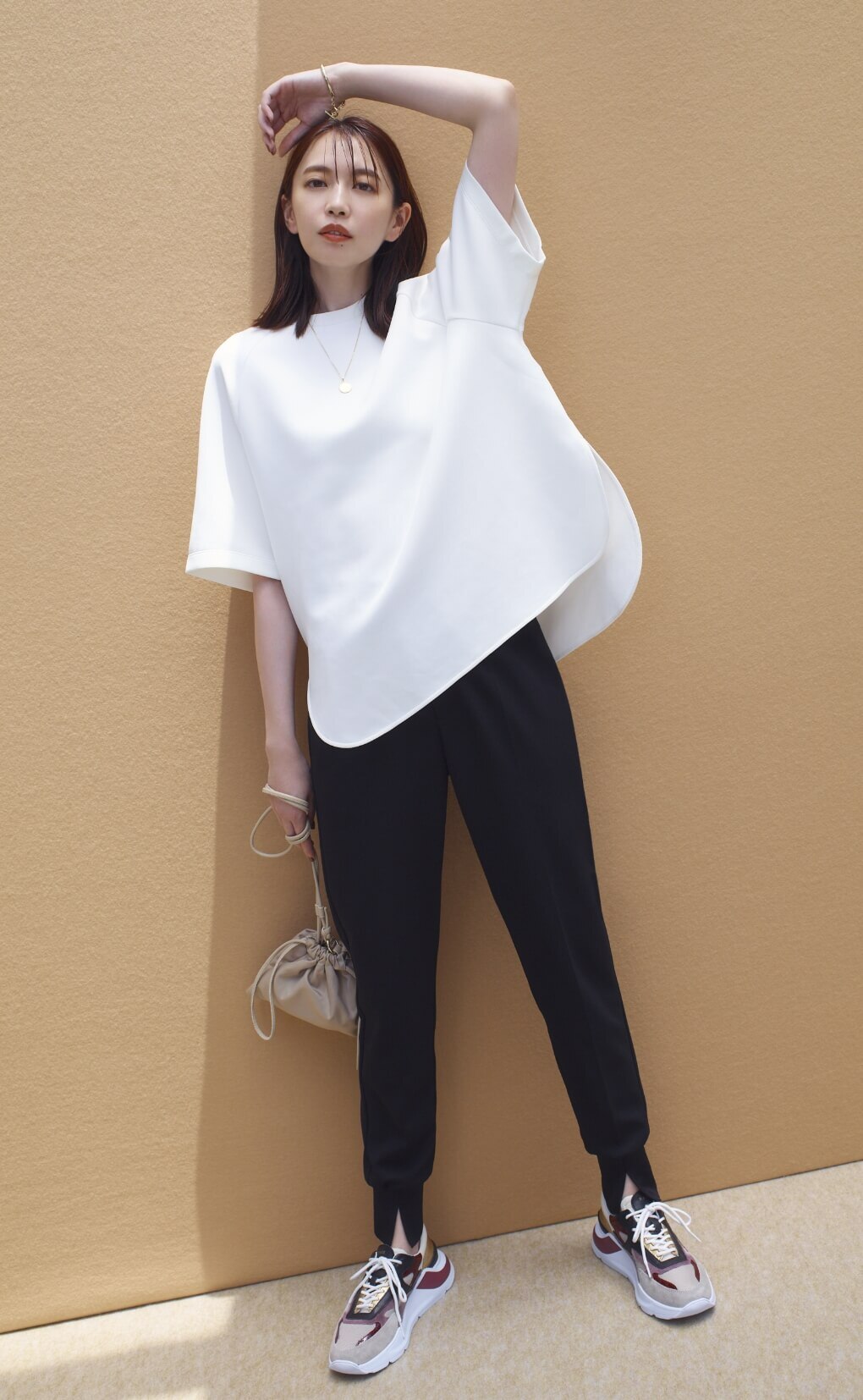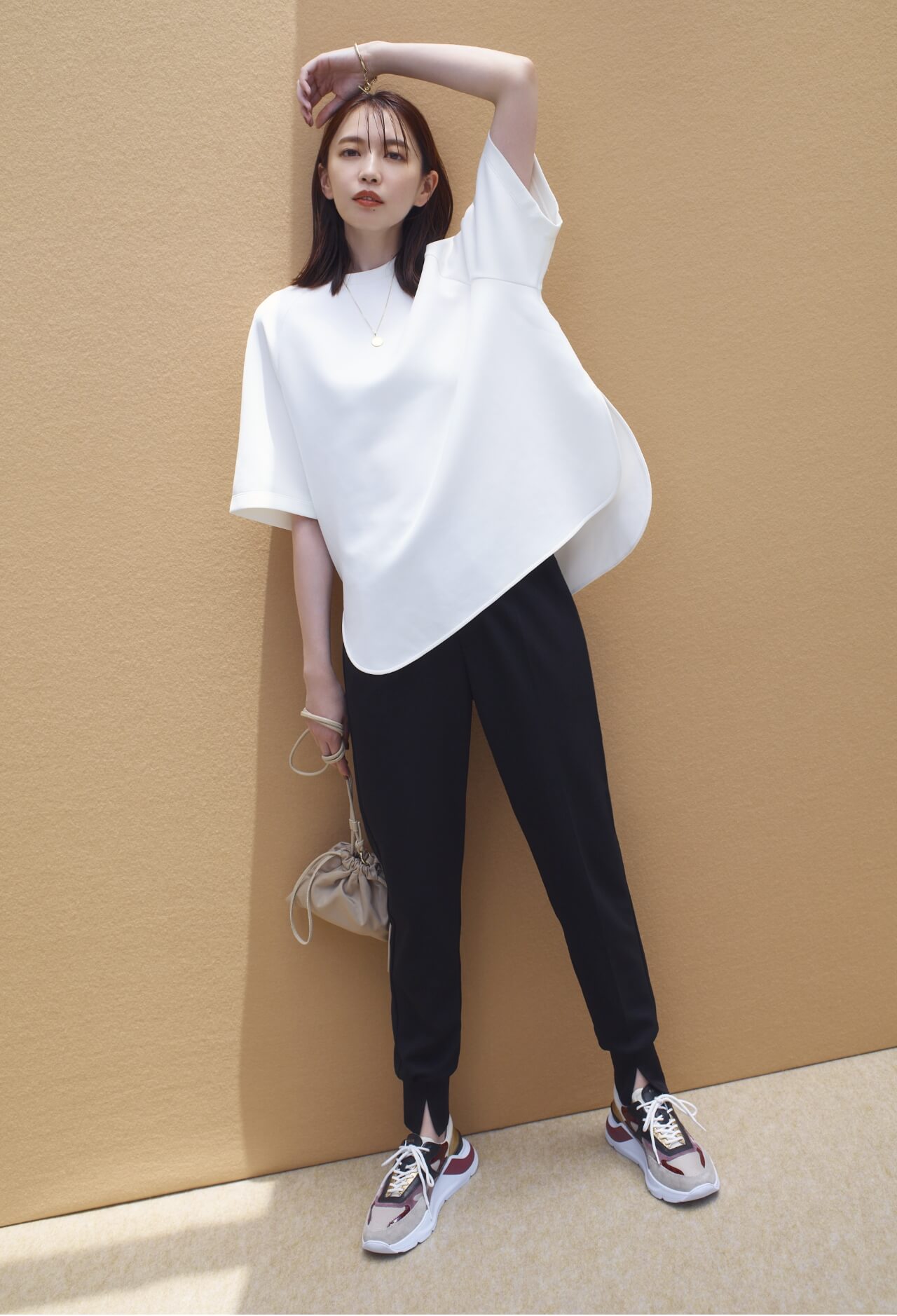 オシャレ賢者からも太鼓判のシルエットと上質な素材感も理想的なジョグパン。接触冷感でUVケア、ストレッチ性もあるので晩夏の屋外も快適。カジュアルながらもキレイめに仕上がるビューティーフォルムトップス合わせで大人カジュアルに。