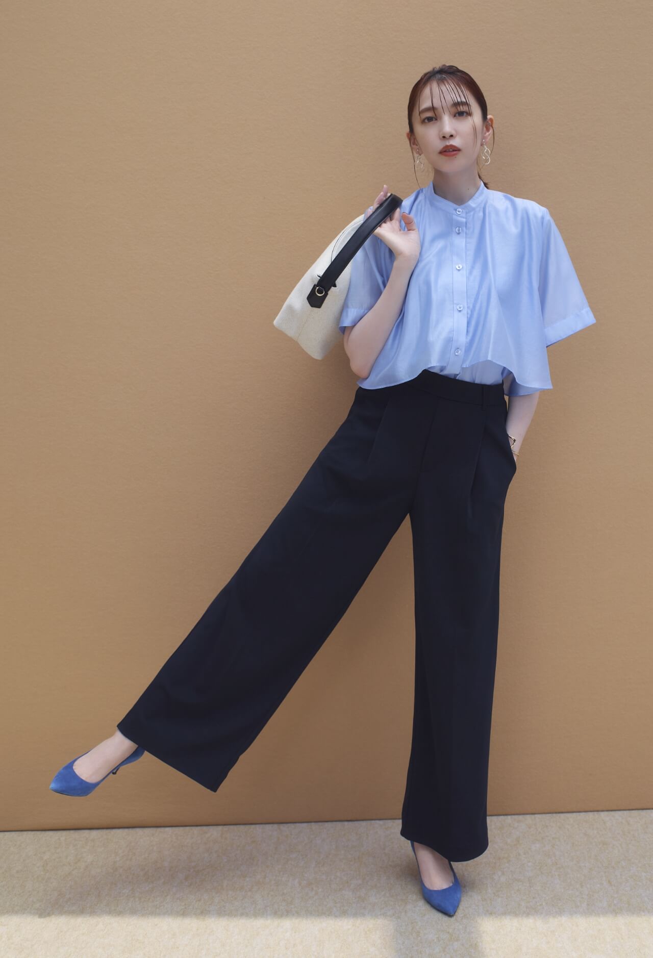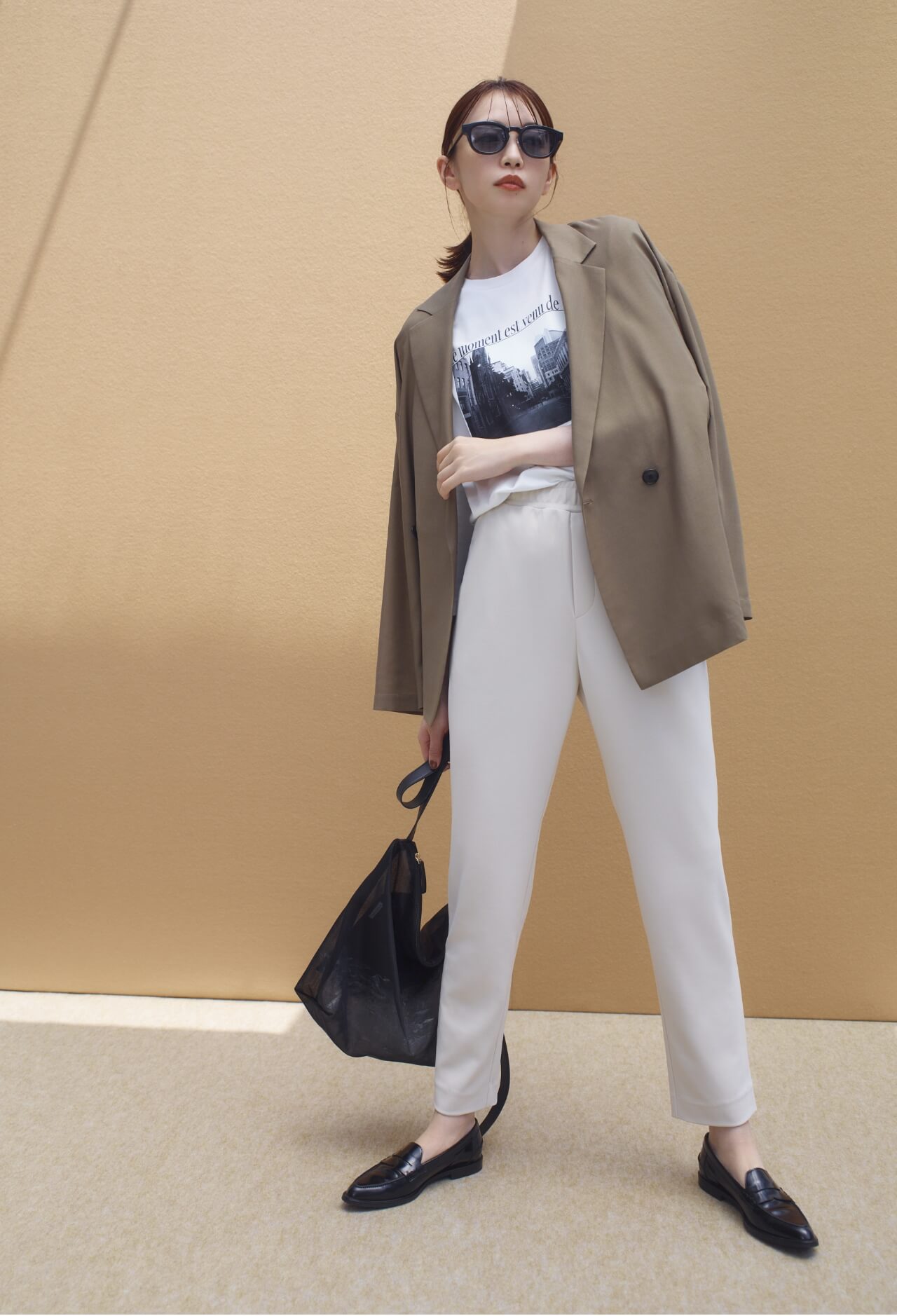 裾に向かって細くなる美ラインと、足首見せの抜け感で、はくだけでスタイルアップ。きちんとシーンにも対応できる優秀パンツ。キレイめかつストレッチが効き、窮屈さを感じません。シャツ感覚の軽いジャケットを羽織ればマニッシュな印象に。