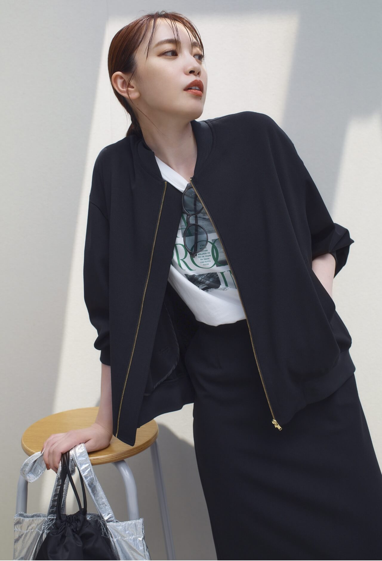 これまで羽織はジャケット一択だった人も注目しているブルゾン。MA-1ほどカジュアルすぎず、素材の高級感と女性らしいコンパクトさで大人のデイリースタイルを格上げできます。キレイめなタイトスカートでも脱コンサバが叶い、羽織るだけで今っぽいコーデが完成します。