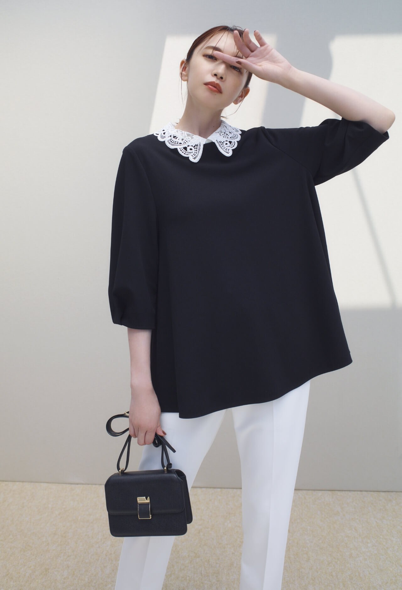 学校行事や華やかな場にも相応しいレース襟ブラウス。かしこまった場に着ていく服はケアに気を遣う服が多い中、吸水速乾で洗える素材は重宝します。レース襟は取り外し可能で着回し力もポイント。フレアシルエットで体のラインを拾わず、パンツとの相性も抜群です。