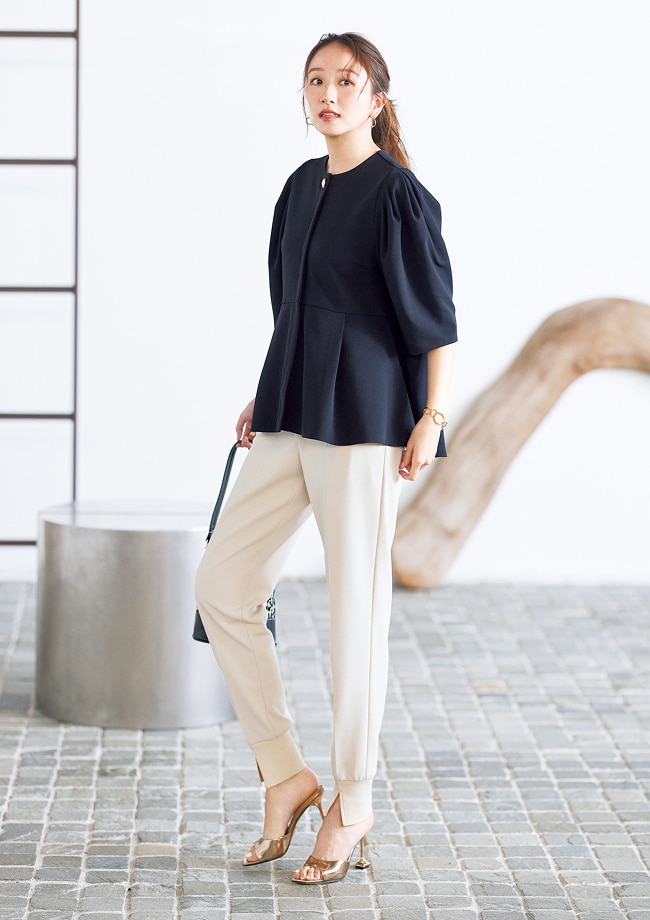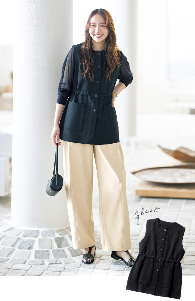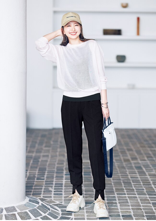 この春はシアーやパステルカラーが旬。トップスに取り入れることでマンネリ化脱出に。薄色トップスは黒パンツのコントラストが強くなるので、黒インナーでつなげると縦ラインも強調できて、すっきり着こなせます。