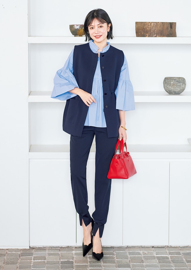 「定番パンツのマンネリ化脱出はシーンによって様々ですが、着まわしテクの幅を広げることと、旬を取り入れてブラッシュアップが近道。3パターンの着こなしをご紹介します。」
