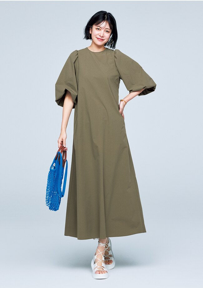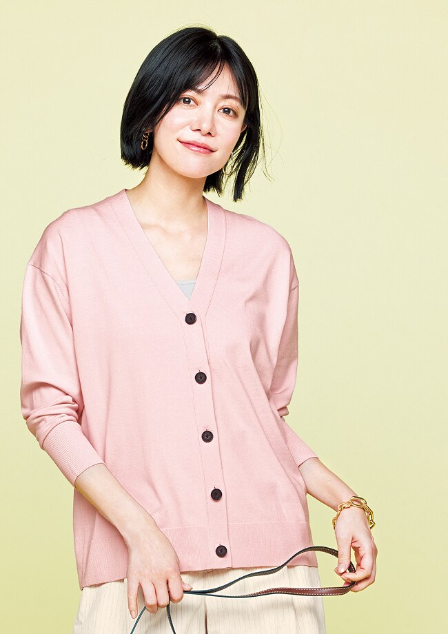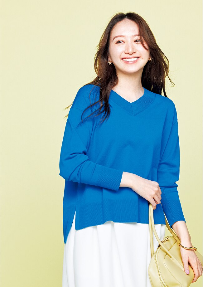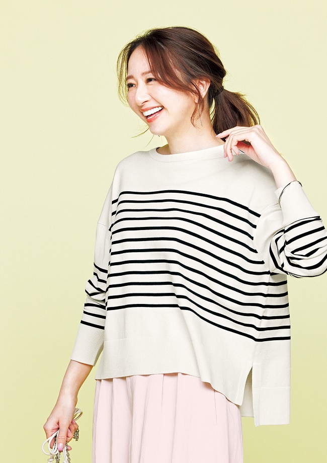 「上半身の体型カバーはオーバーサイズすぎると逆効果。適度なゆとりに加えて、首の開きや丈感、柄の入り方で顔まわりの印象が変わります。腕まわりのすっきりにはドロップショルダーも効果的。それぞれのポイント選びが鍵に。」