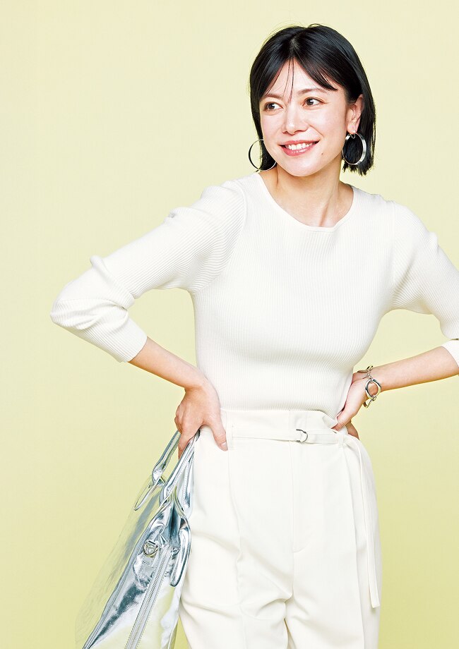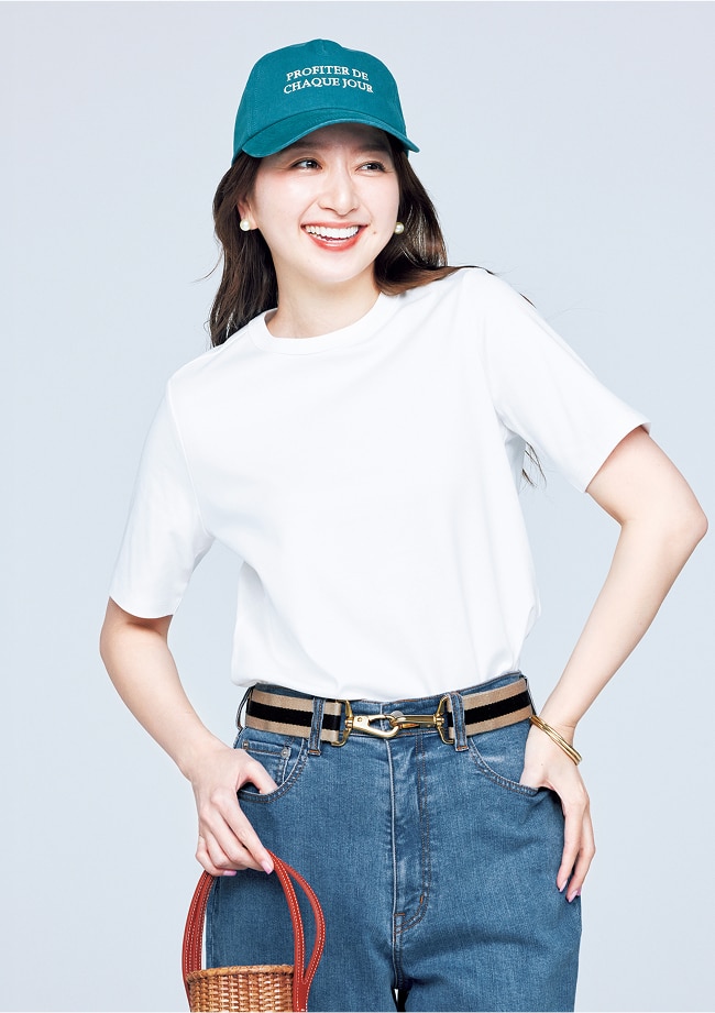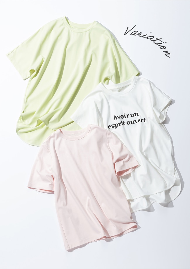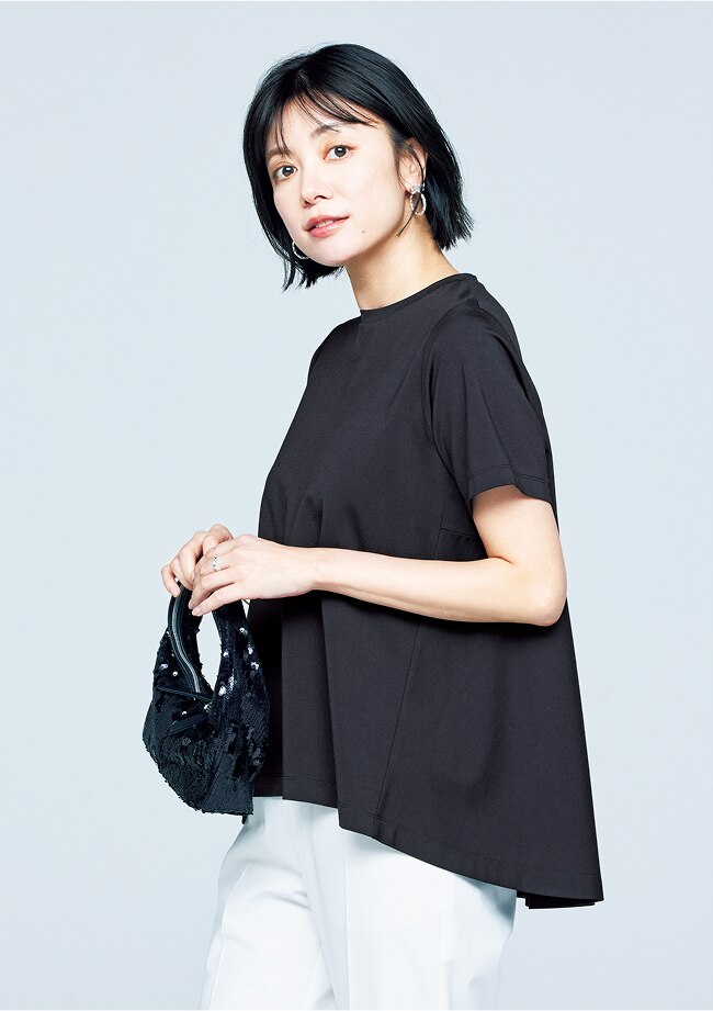 「デイリーの必須アイテムと言えばカットソートップス。シンプルだからこそ体のラインを拾いにくい素材やデザインを選ぶのが大人にとって重要。前後差丈やサイドスリット、腕まわりをカバーする袖丈も選びのコツに。」